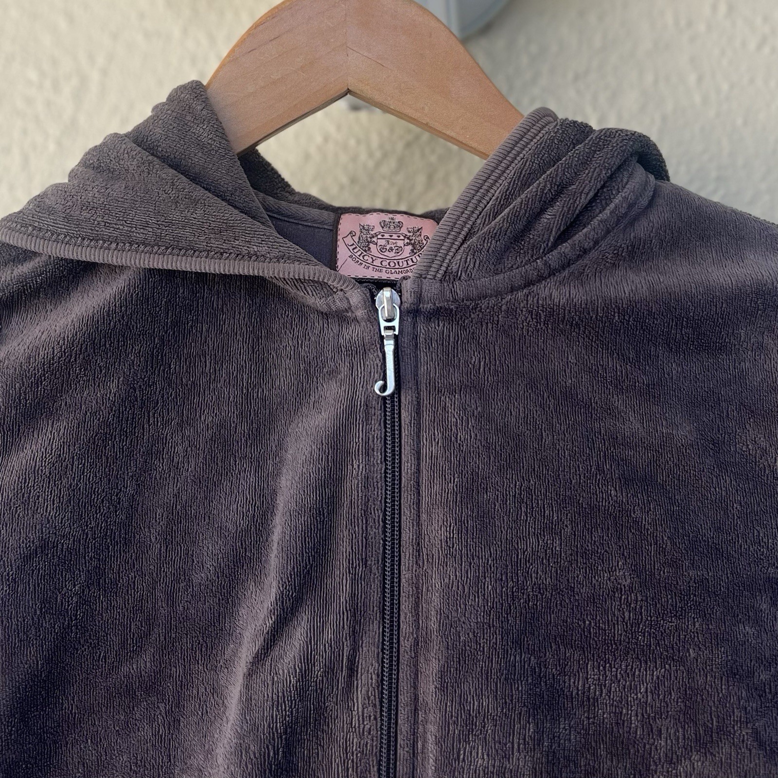 как выглядит Vintage Y2K Juicy Couture Velour Zip Up Hooded Track Jacket Small Bling Logo фото