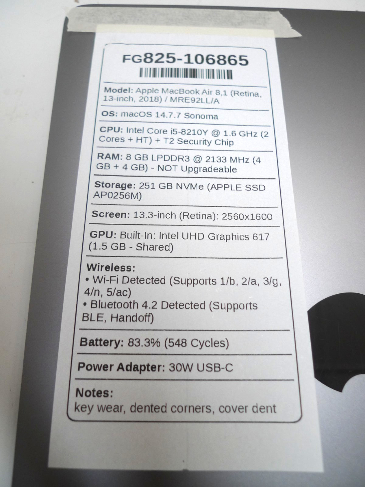 MacBook Air 13 2018 i5-8210Y 8GB RAM 256GB NVMe 548 Cycles READ