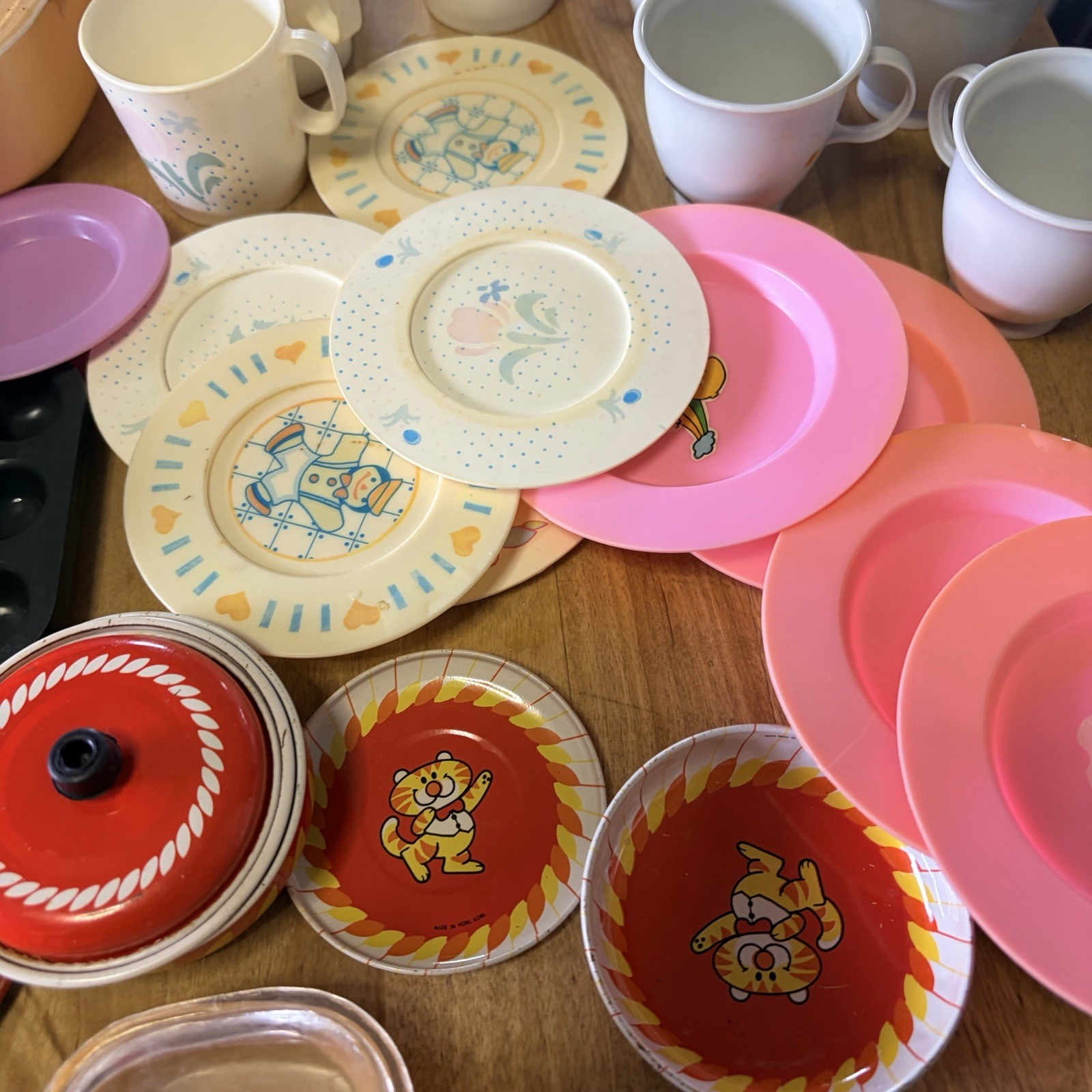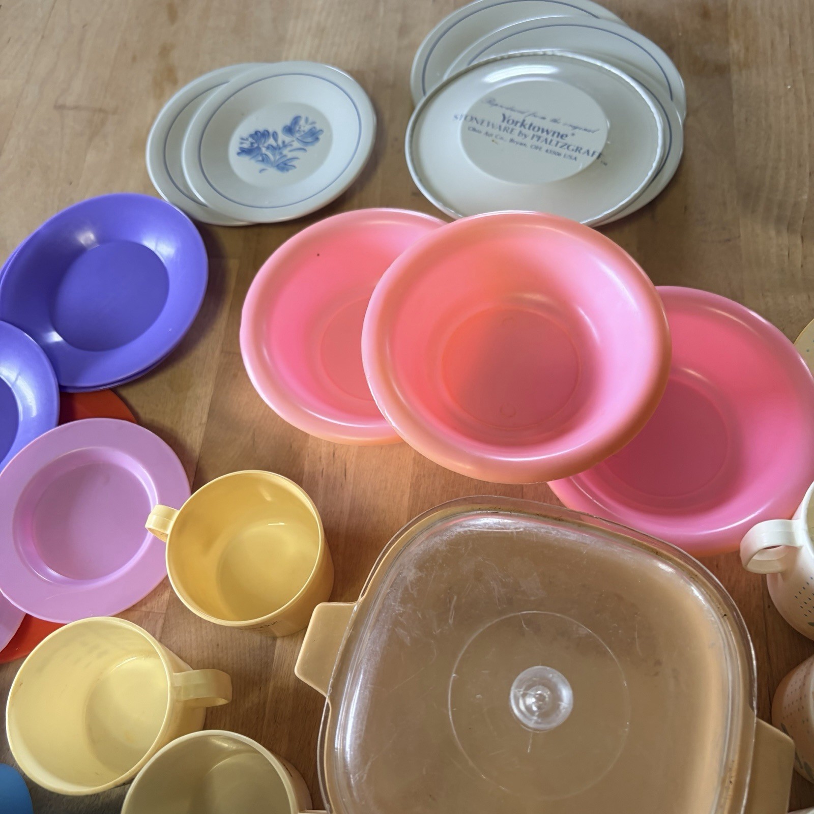 40 pcs Vintage Children's Toy Kitchen Dishes Plastic Tin 1970's Pfaltzgraff