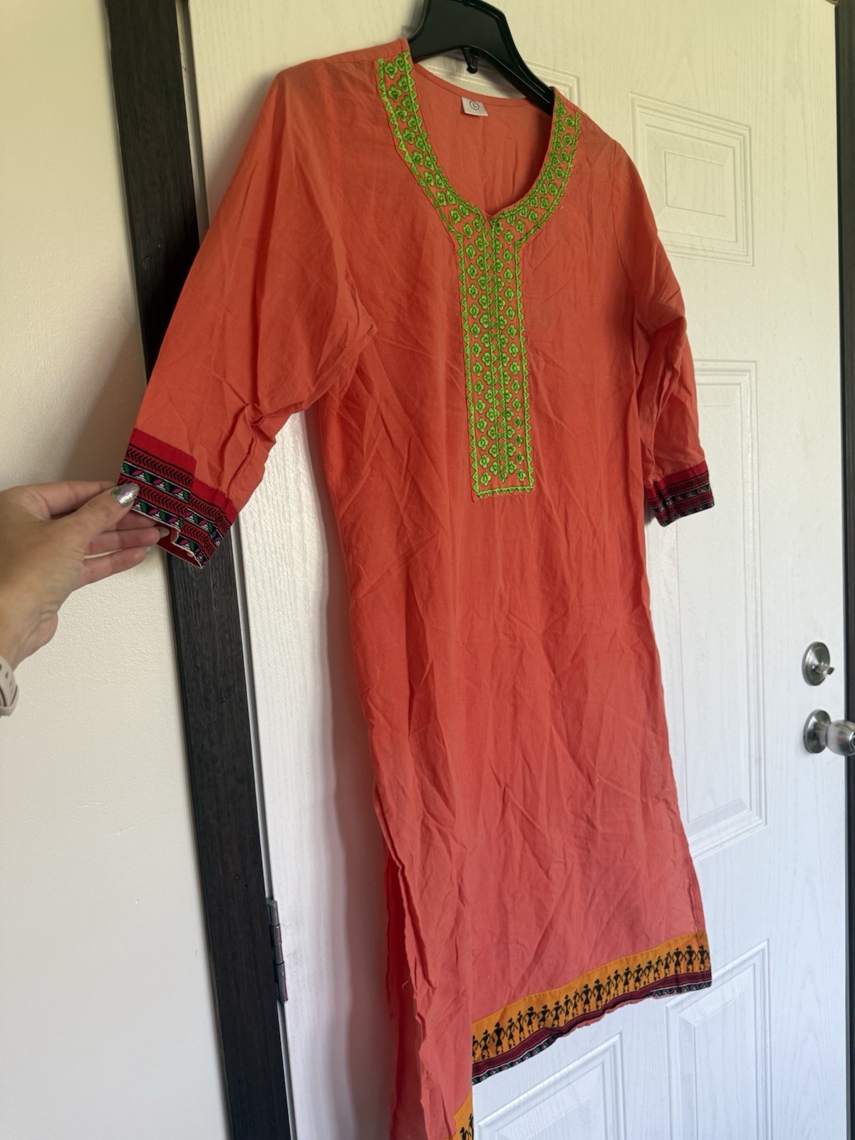 как выглядит peach-colored kurti tunic featuring green neck embroidery traditional hem фото