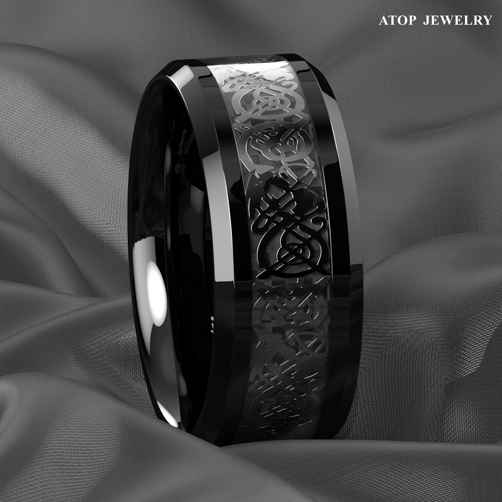 8mm Classic Silver Celtic Dragon Black Tungsten Carbon Ring ATOP men s jewelry