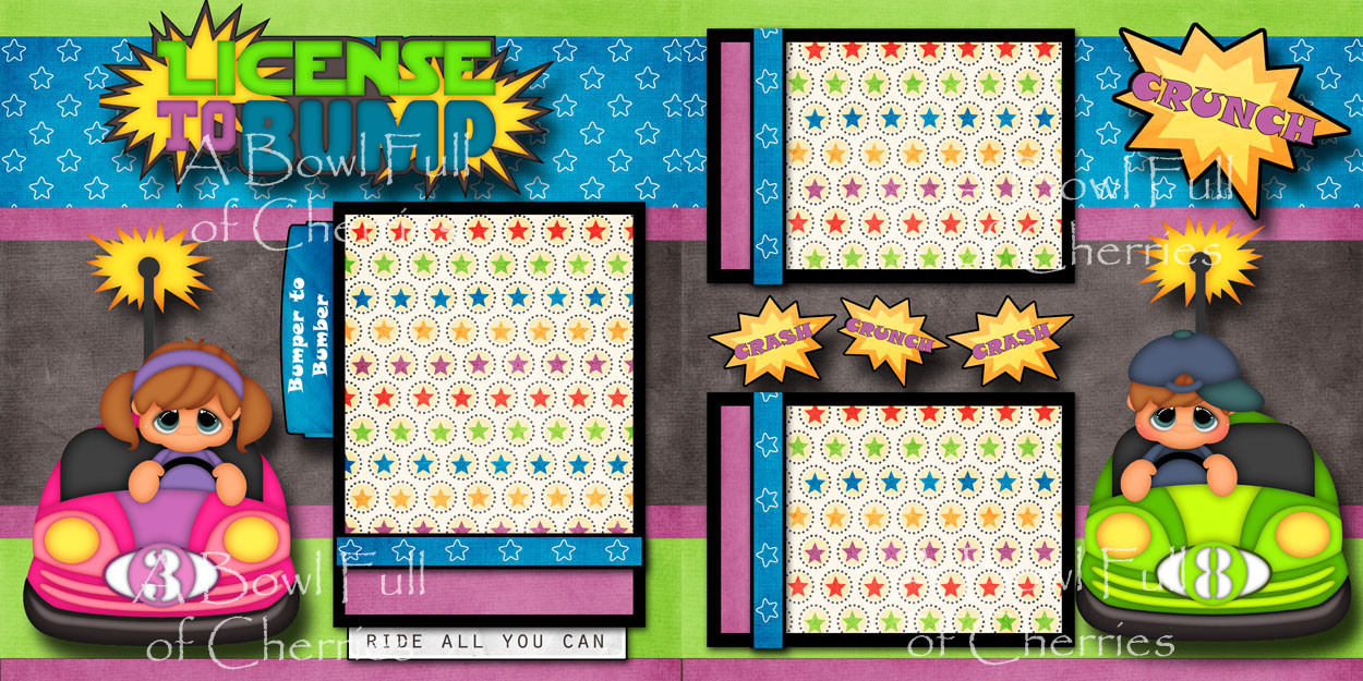 BUMPER CARS amusement park ride 2 premade scrapbook printed pages paper CHERRY