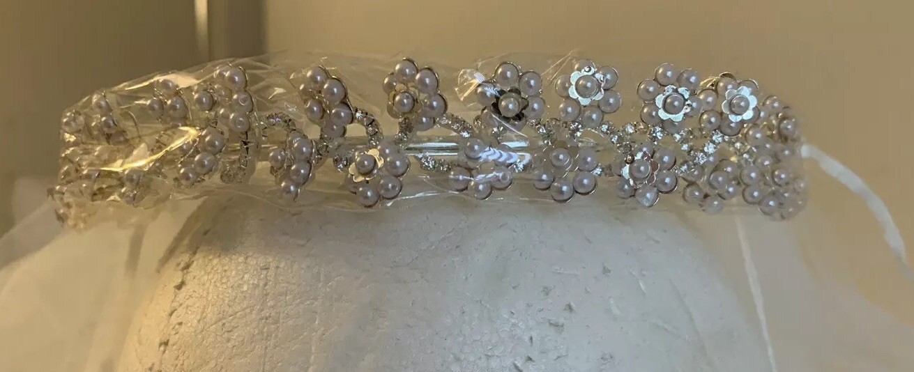 как выглядит Bridal Headpiece Pearl Flowers And Rhinestones With Veil T G New With Tag фото
