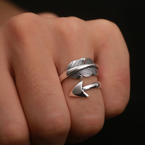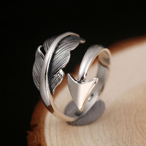 Solid Sterling Silver 925 Feathers Cupid's Sword Open Love Ring Women Men Gift