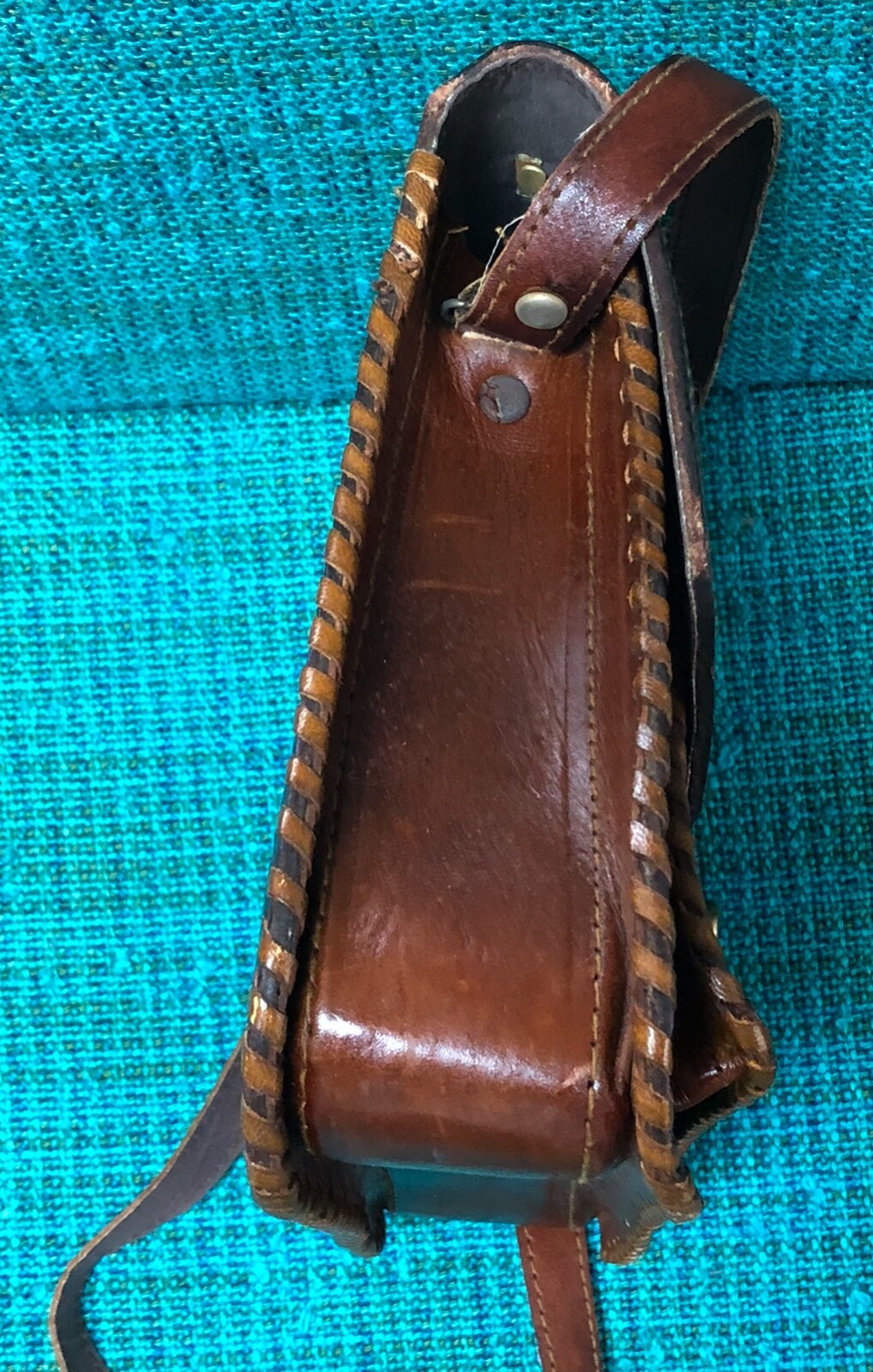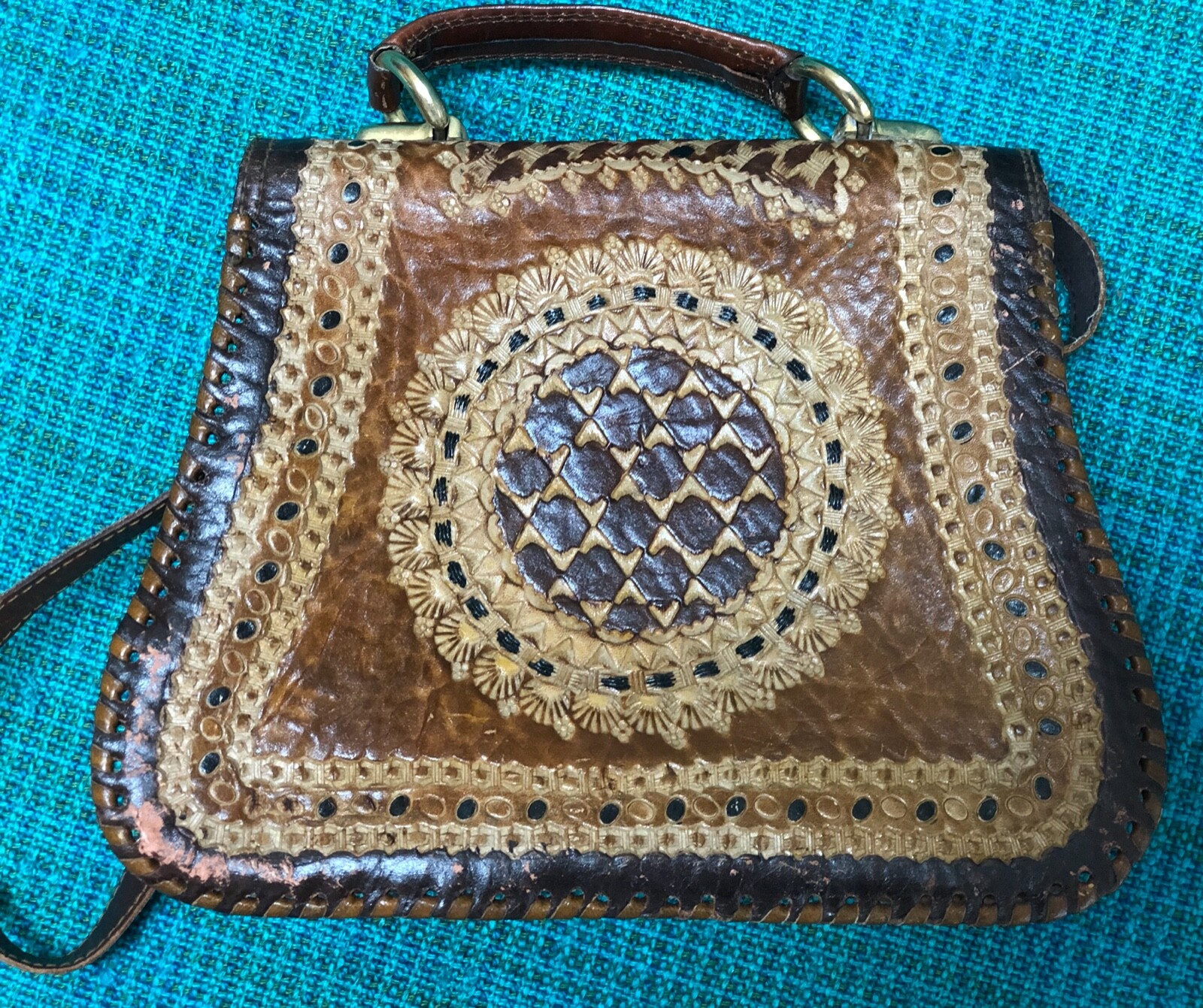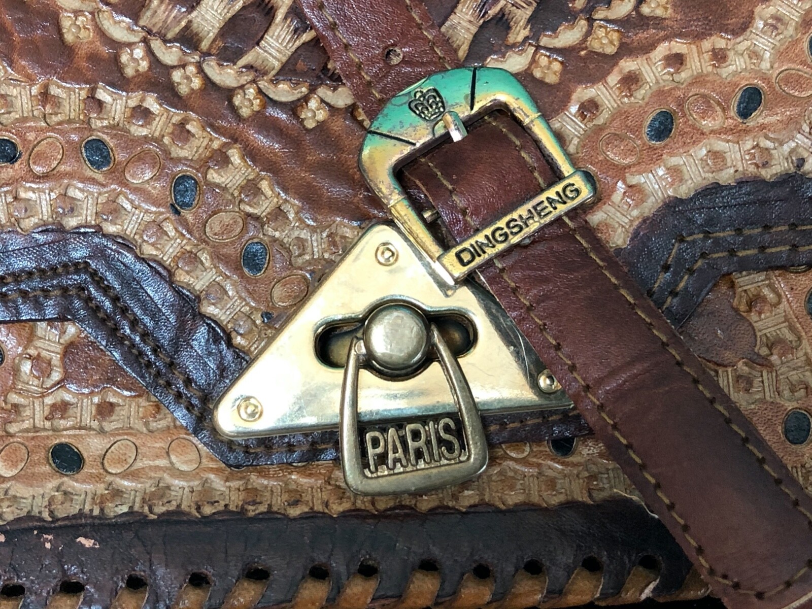LEATHER TOOLED PURSE BY DINGSHENG / PARIS, VINTAGE, BROWN, SHOULDER STRAP/HANDLE