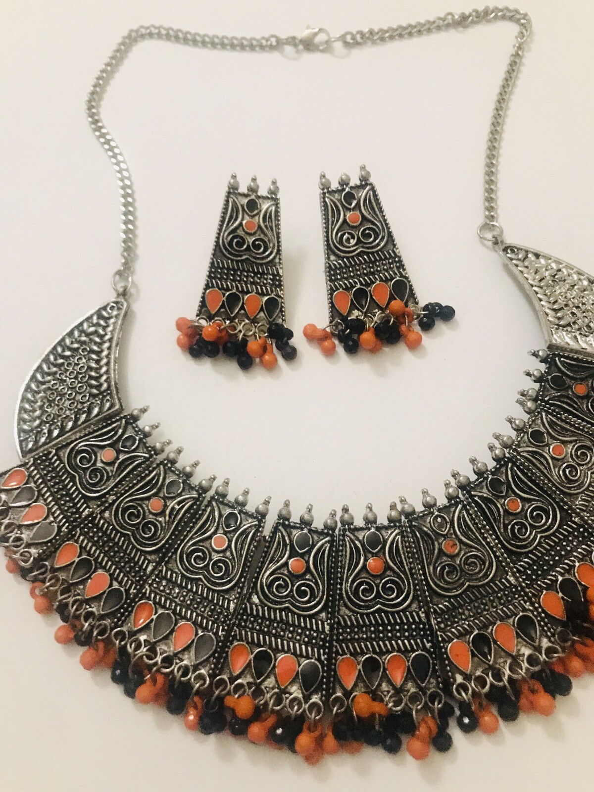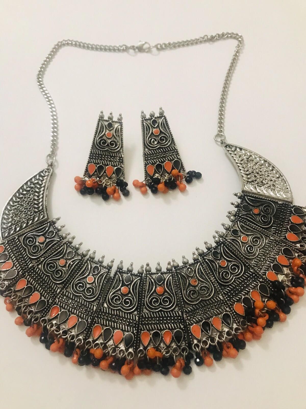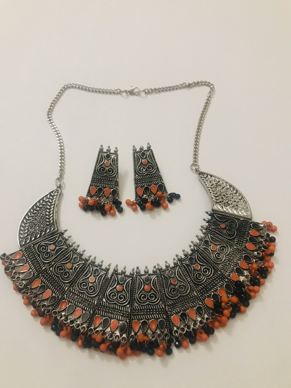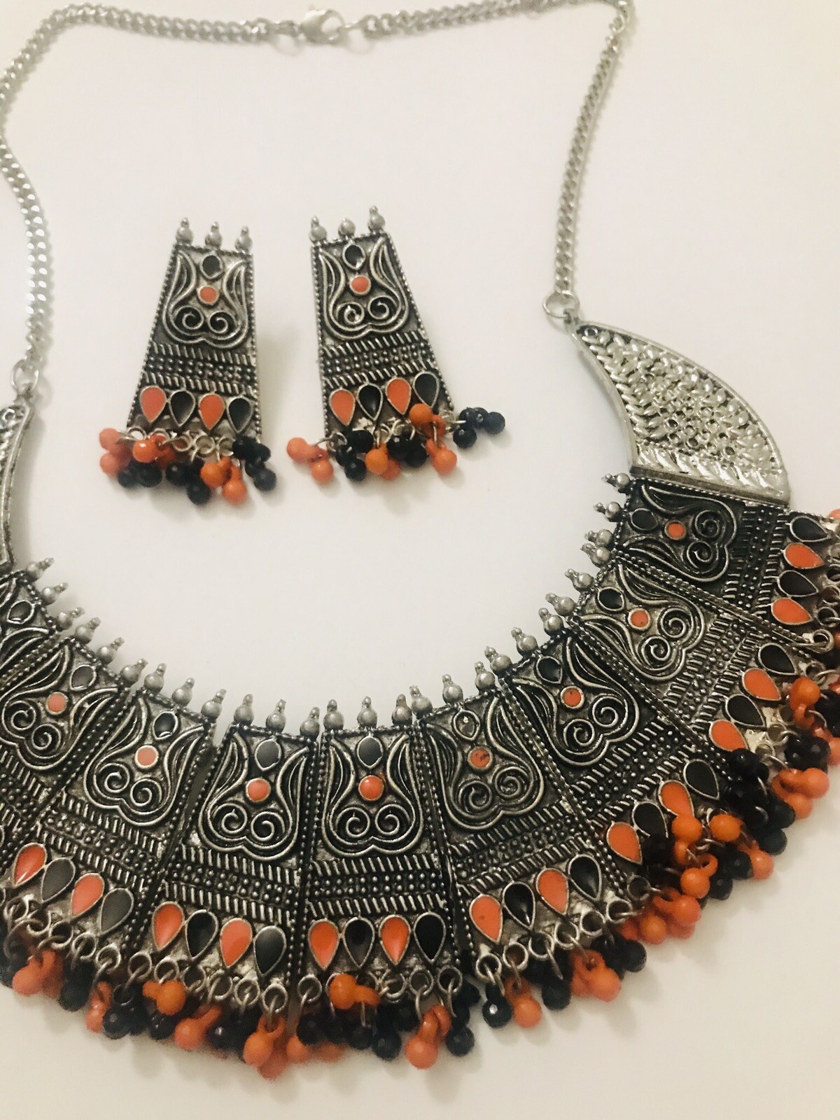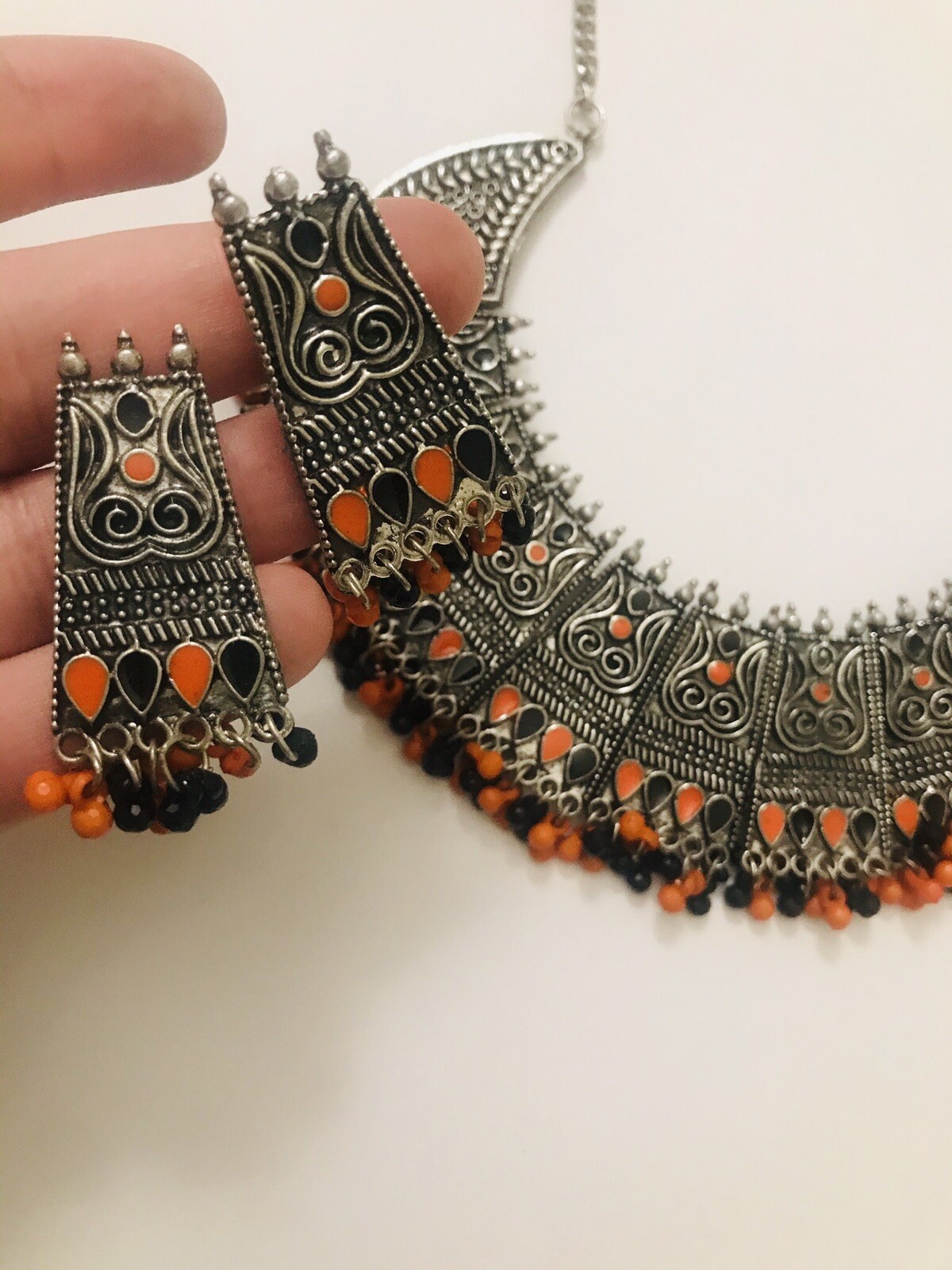 Indian Ethnic Oxidised Silver Orange Black Beads Tribal Choker Earrings Set