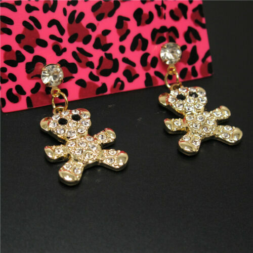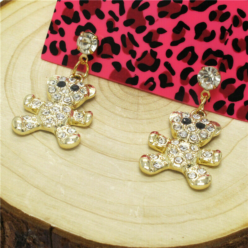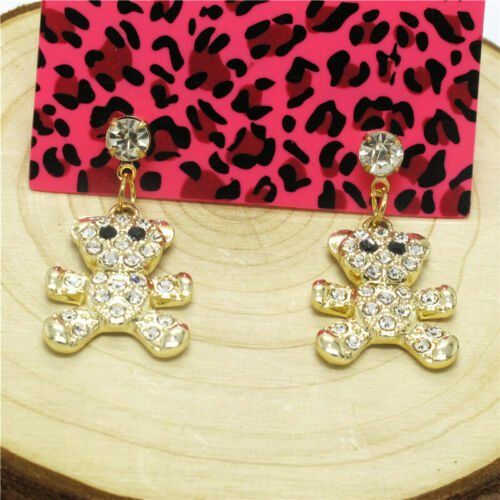 Cute New Gold Enamel Clear Crystal Teddy Bear Charm Stud Dangle Earrings