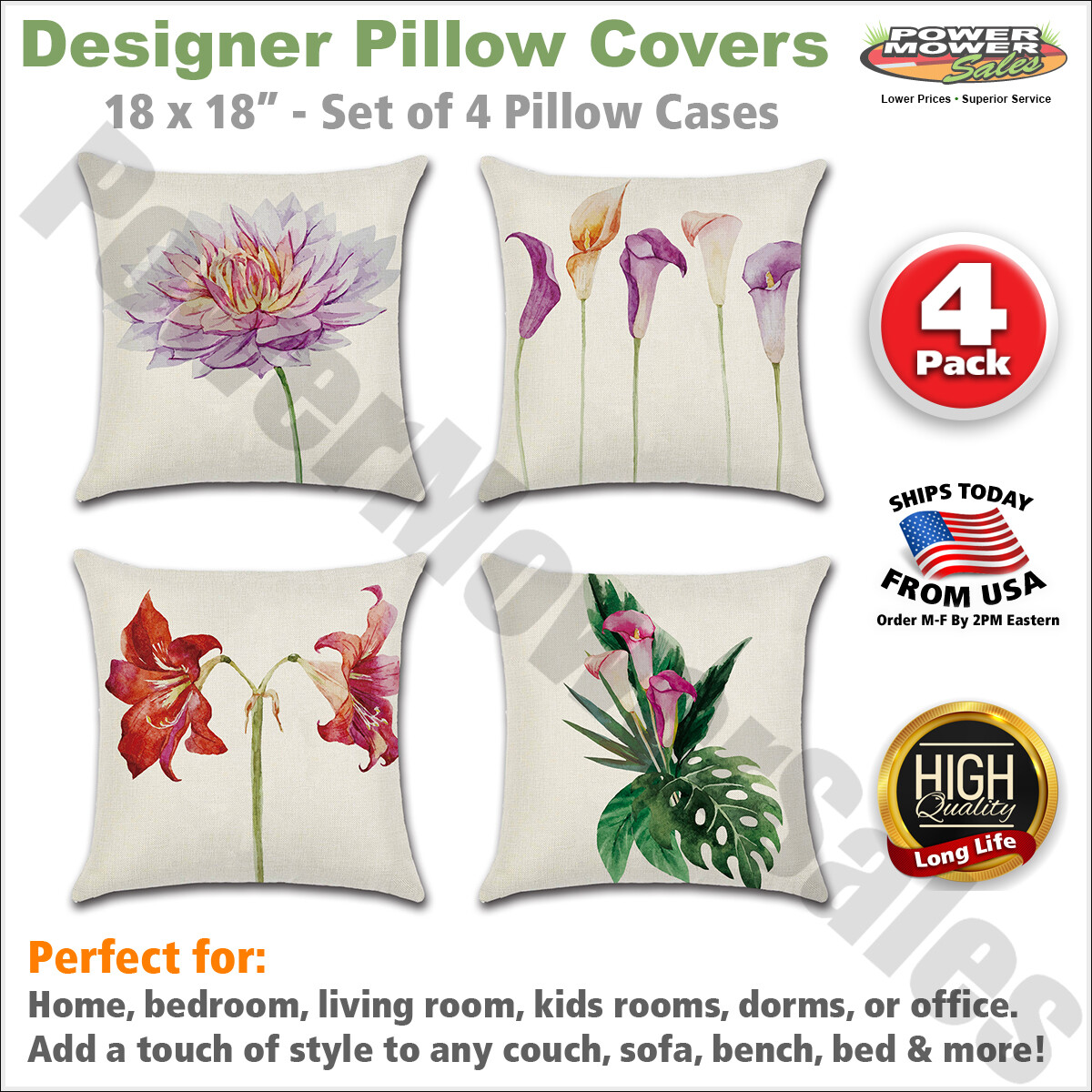 Set of 4 Pillow Covers 18x18, Flower Themed Design Cotton Linen Fabric