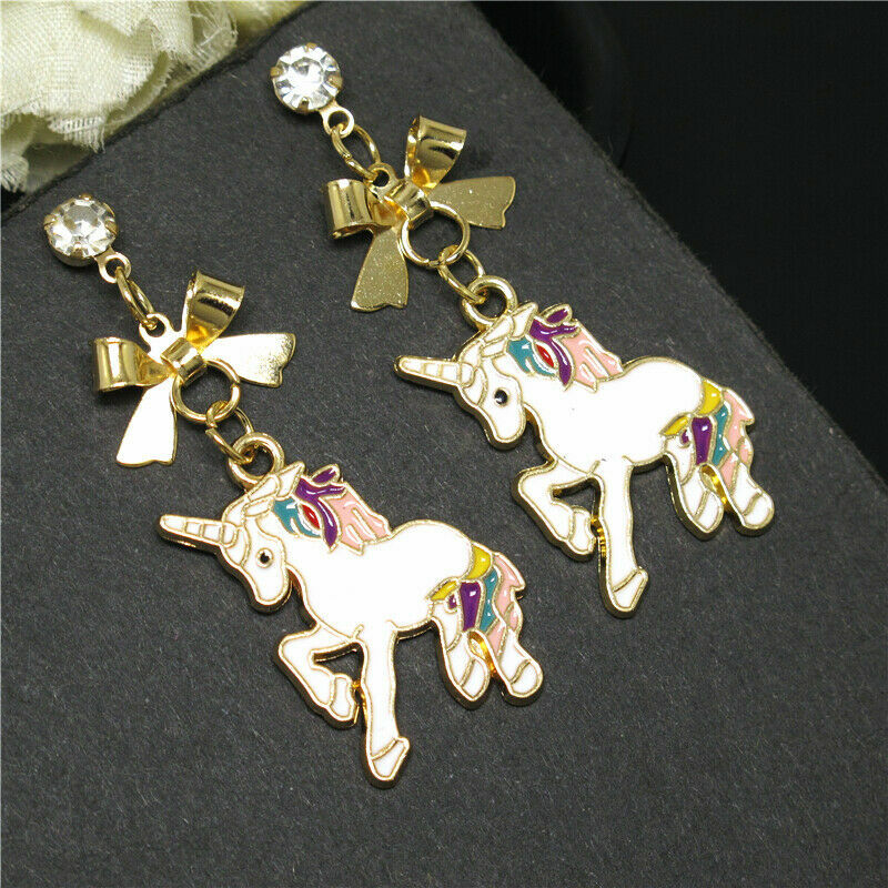 Cute New Yellow Gold Multi-Color Enamel Unicorn Charm Stud Dangle Drop Earrings