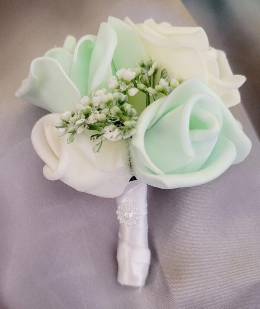 как выглядит Bride Brooch Bouquet and Groom Boutonni re Mint Green and off White фото