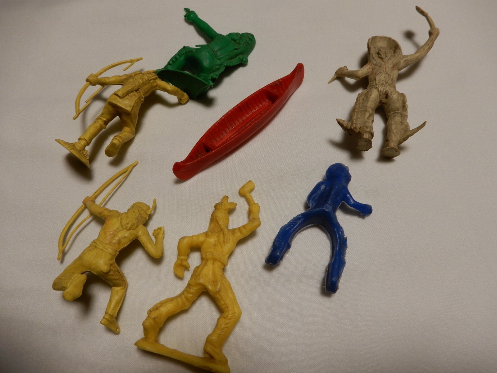 VINTAGE LOT OF 6 1950'S PLASTIC TOY INDIANS AND CANOE VARIOUS POSITIONS