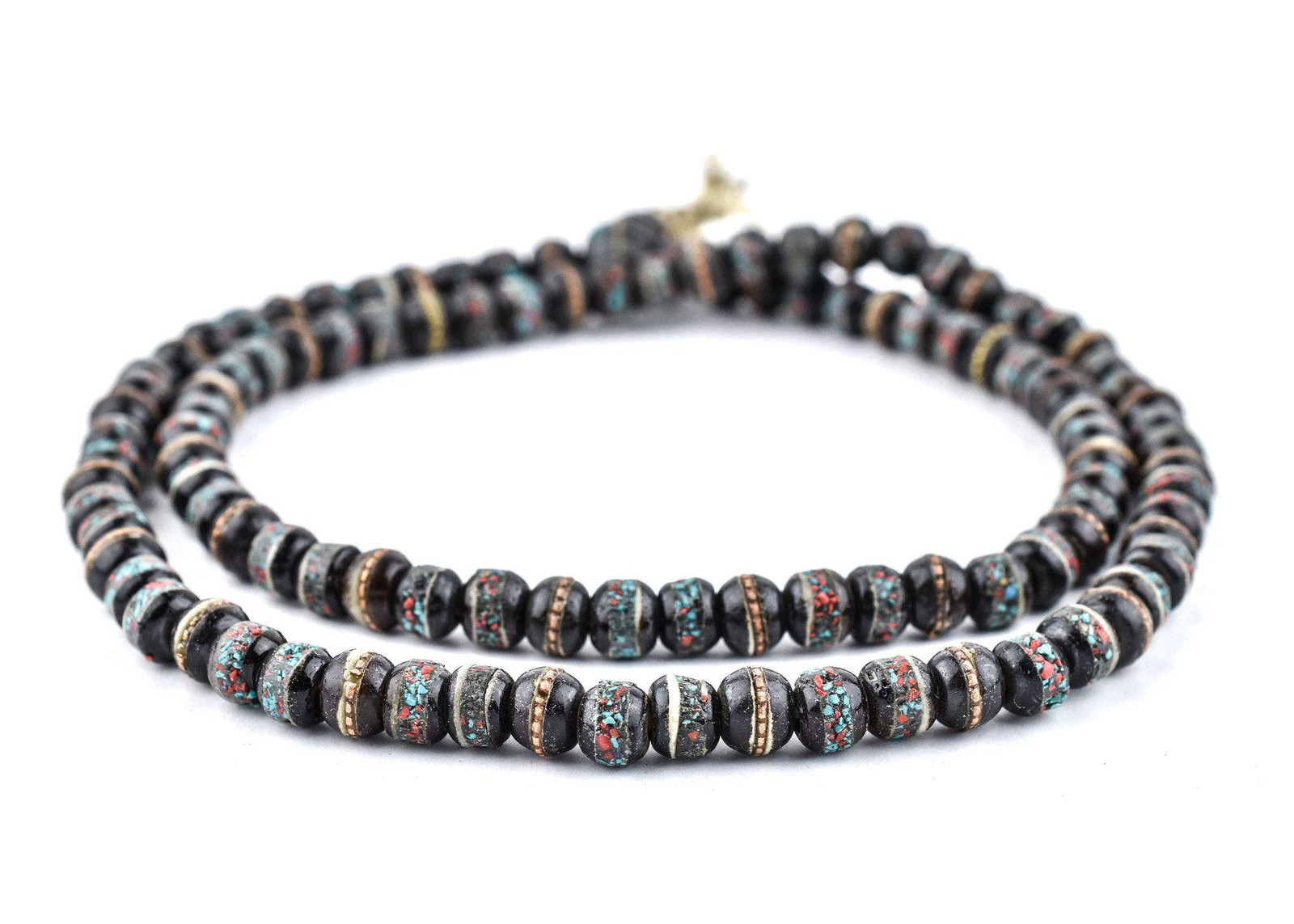 Black Speckled Inlaid Bone Mala Beads 8mm Nepal Multicolor Round Large Hole