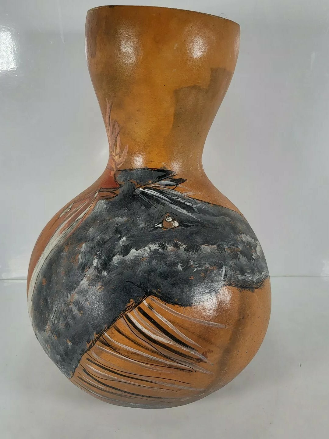 Hand Painted Horse Heads Gourd Art Pot Vase, Signed 10 tall