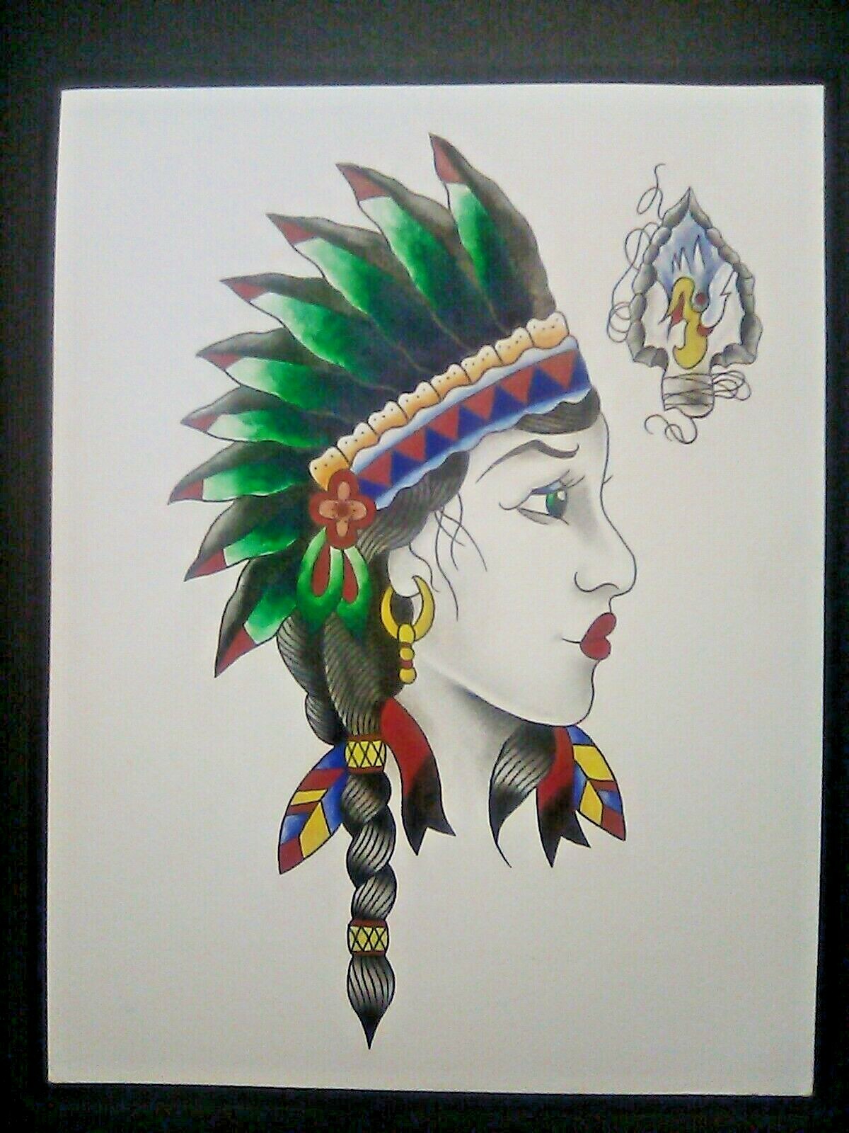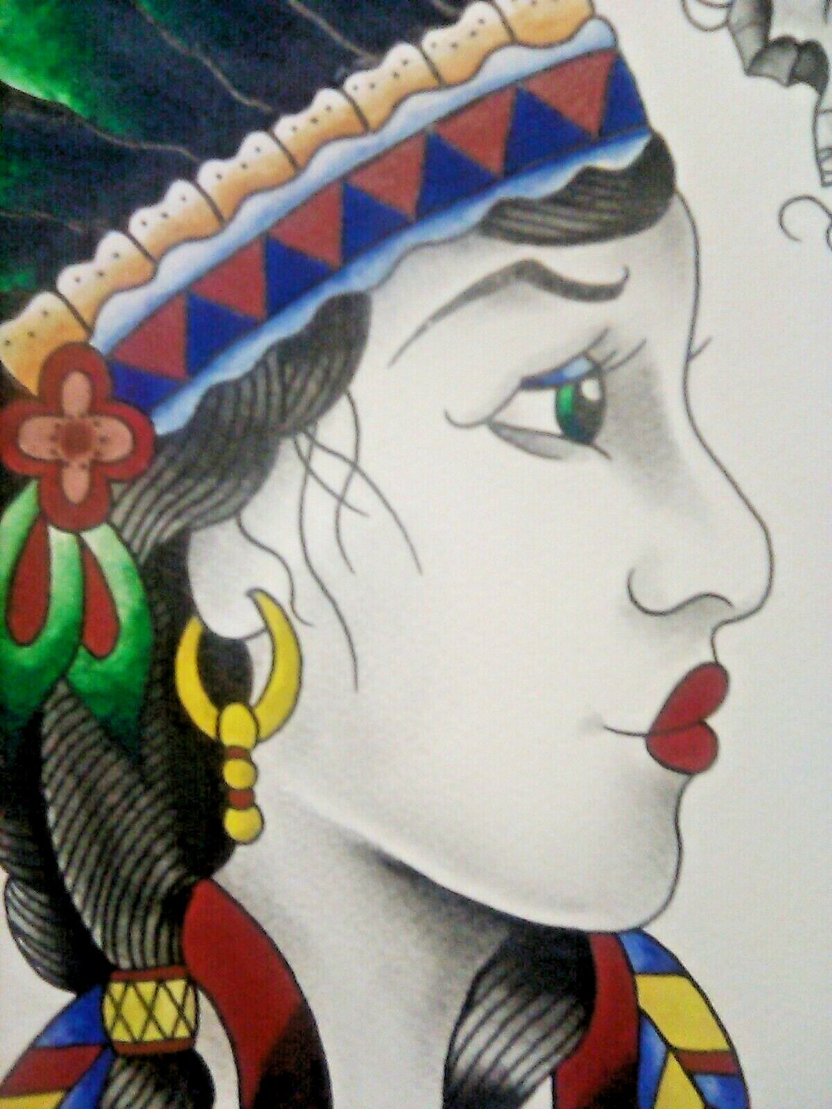 INDIAN WOMAN Painting TATTOO Art EAGLE American Chief Native tribe feathers bird