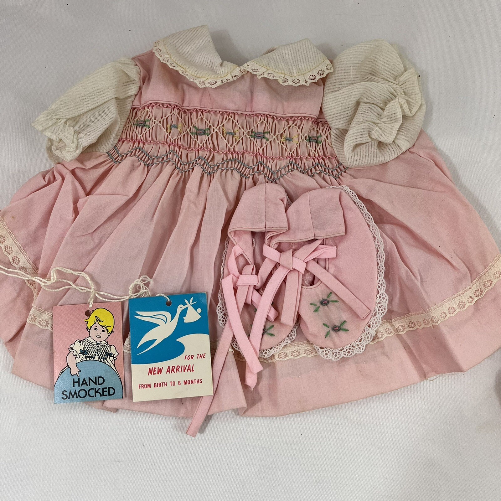 как выглядит Vintage 80s Bring Baby Girl Home Hand Smocked Dress Boxed Outfit Pink Cradle Tog фото