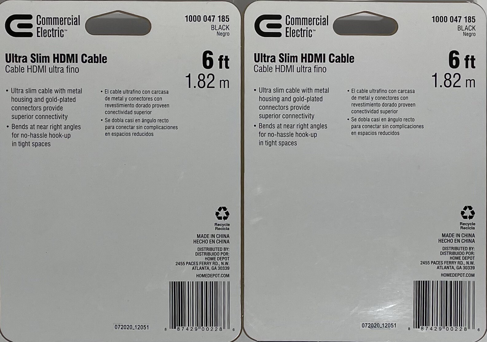 2 packs 6 ft. Ultra-Slim HDMI Cable Commercial Electric Black Gold-Plated Ends