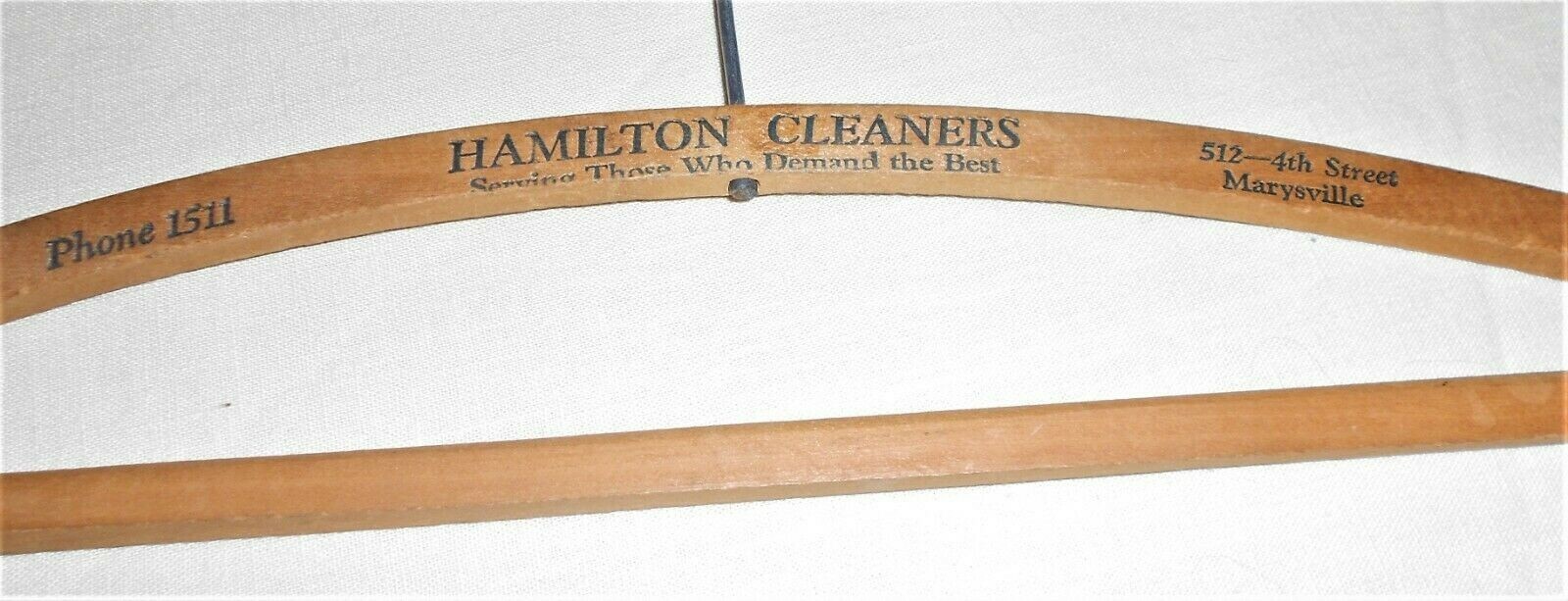 OLD VTG WOOD CLOTHS HANGER MARTINIZER HAMILTON CLEANERS MARYSVILLE PHONE 1511