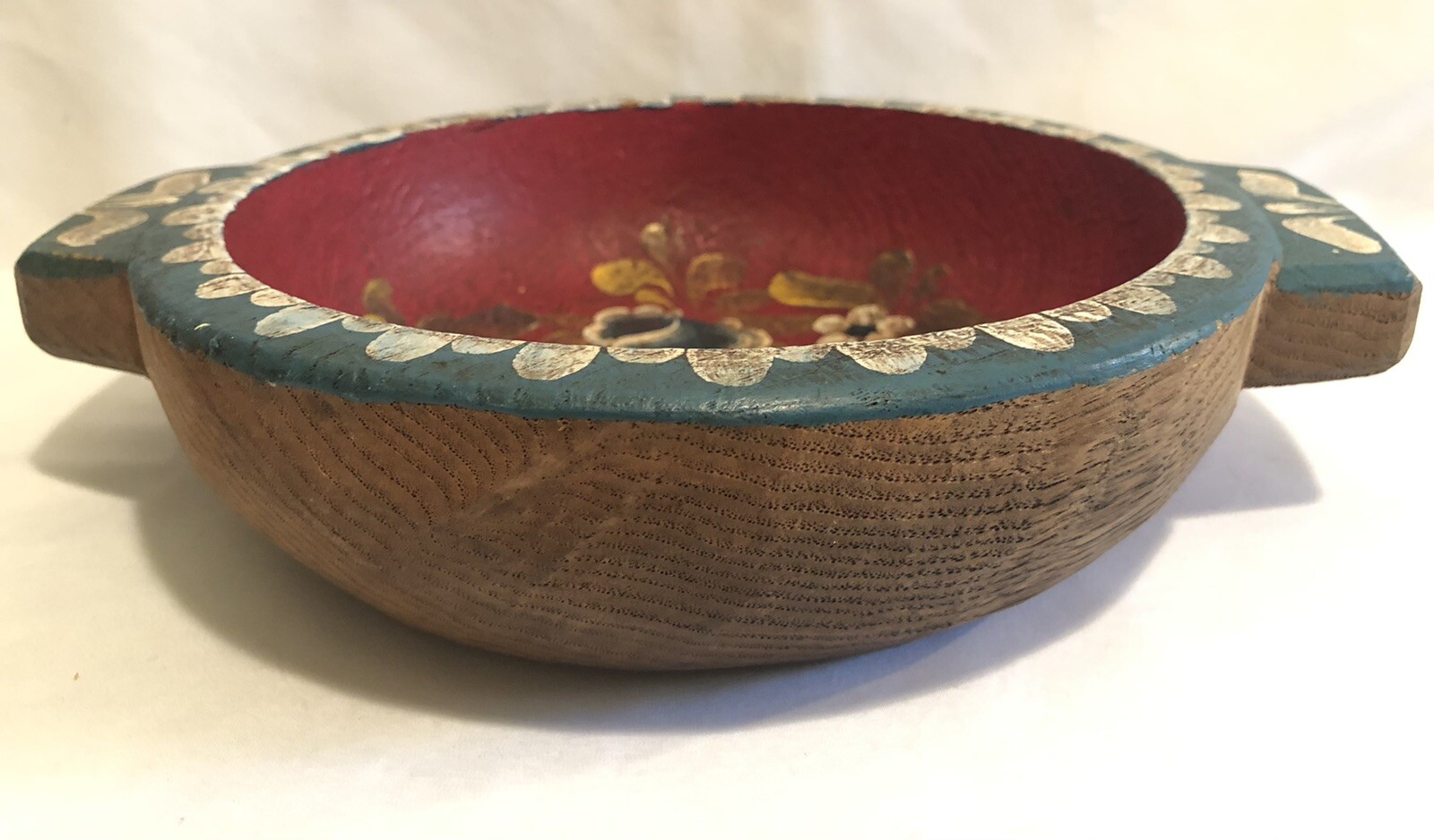Painted Flowers Decorative Carved Wooden Bowl W/Handles