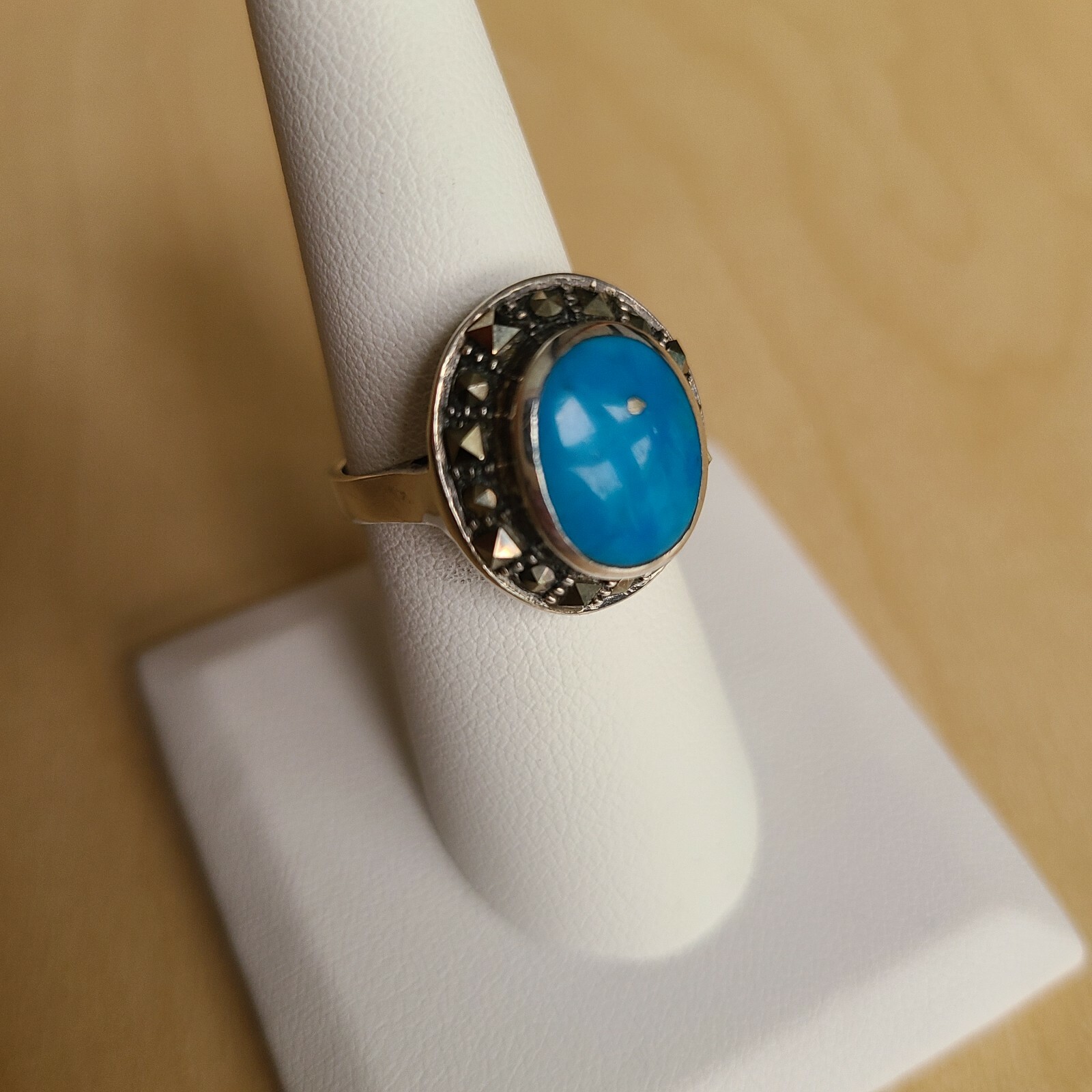 VINTAGE STERLING SILVER 925 BLUE STONE AND MARCASITES RING SIZE 7.75