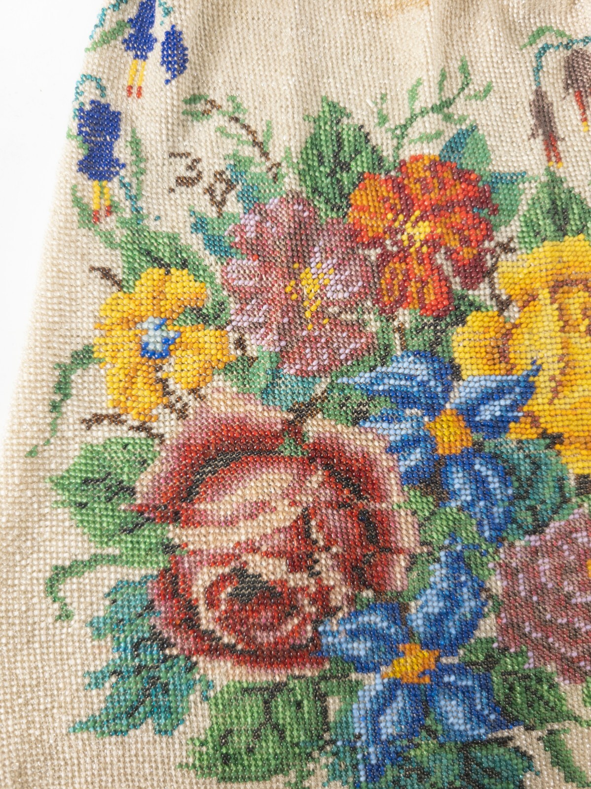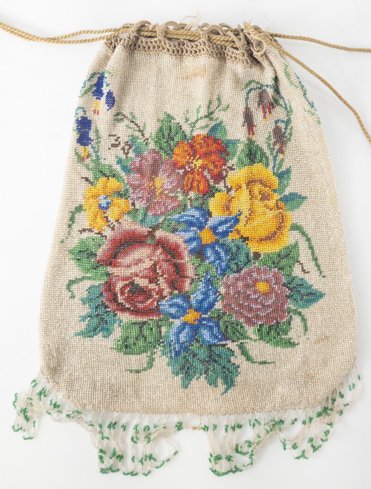Antique French Art Deco Micro Beaded Handbag Purse Floral Design Drawstring