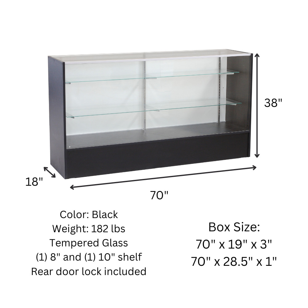 Black Wood Full Vision 70 Inch Glass Display Showcase with Adjustable Shelves
