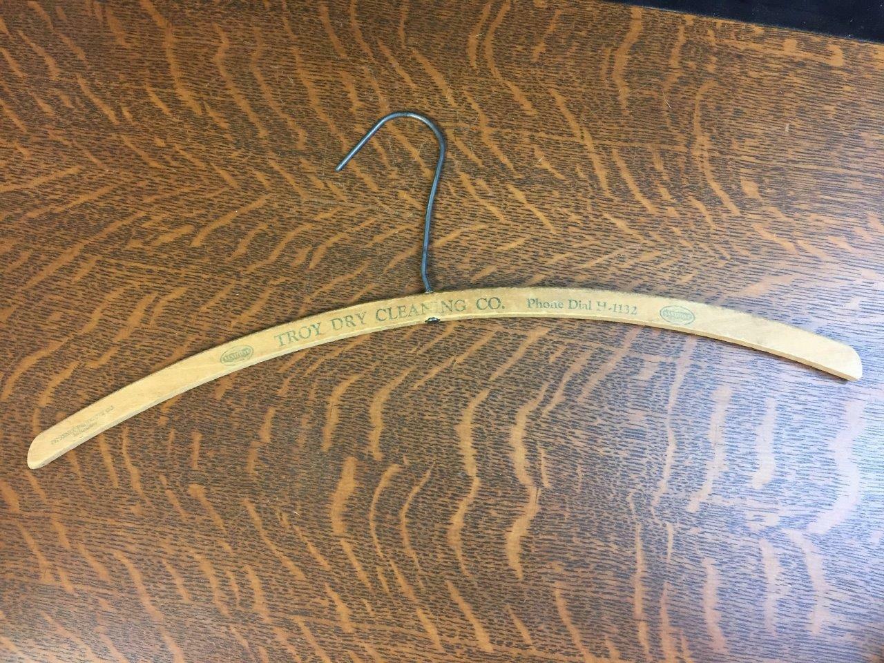 Antique Vintage TROY DRY CLEANING CO. Wooden Clothes Hanger Cleaners Advertising