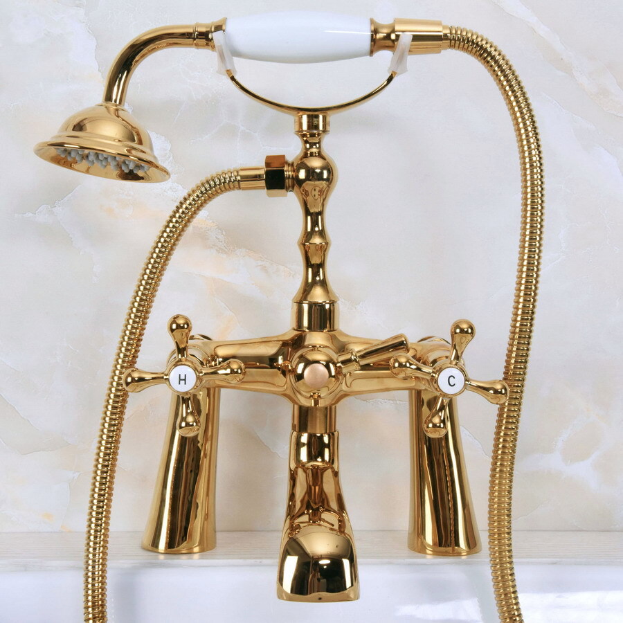 Gold Brass Bath Bathtub Clawfoot Tub Faucet W/ Hand Shower Deck Mounted ena152