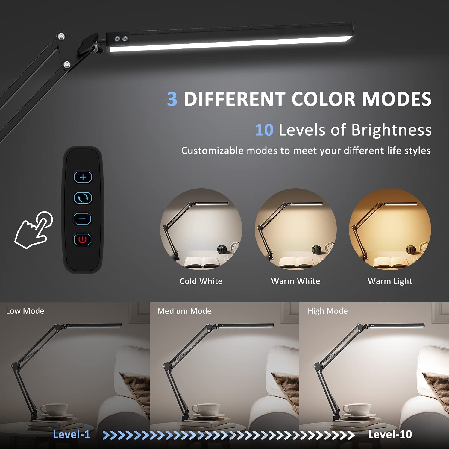 Adjustable LED Desk Lamp Eye-Caring Desk Light with Clamp Swing Arm 3 Color Mode