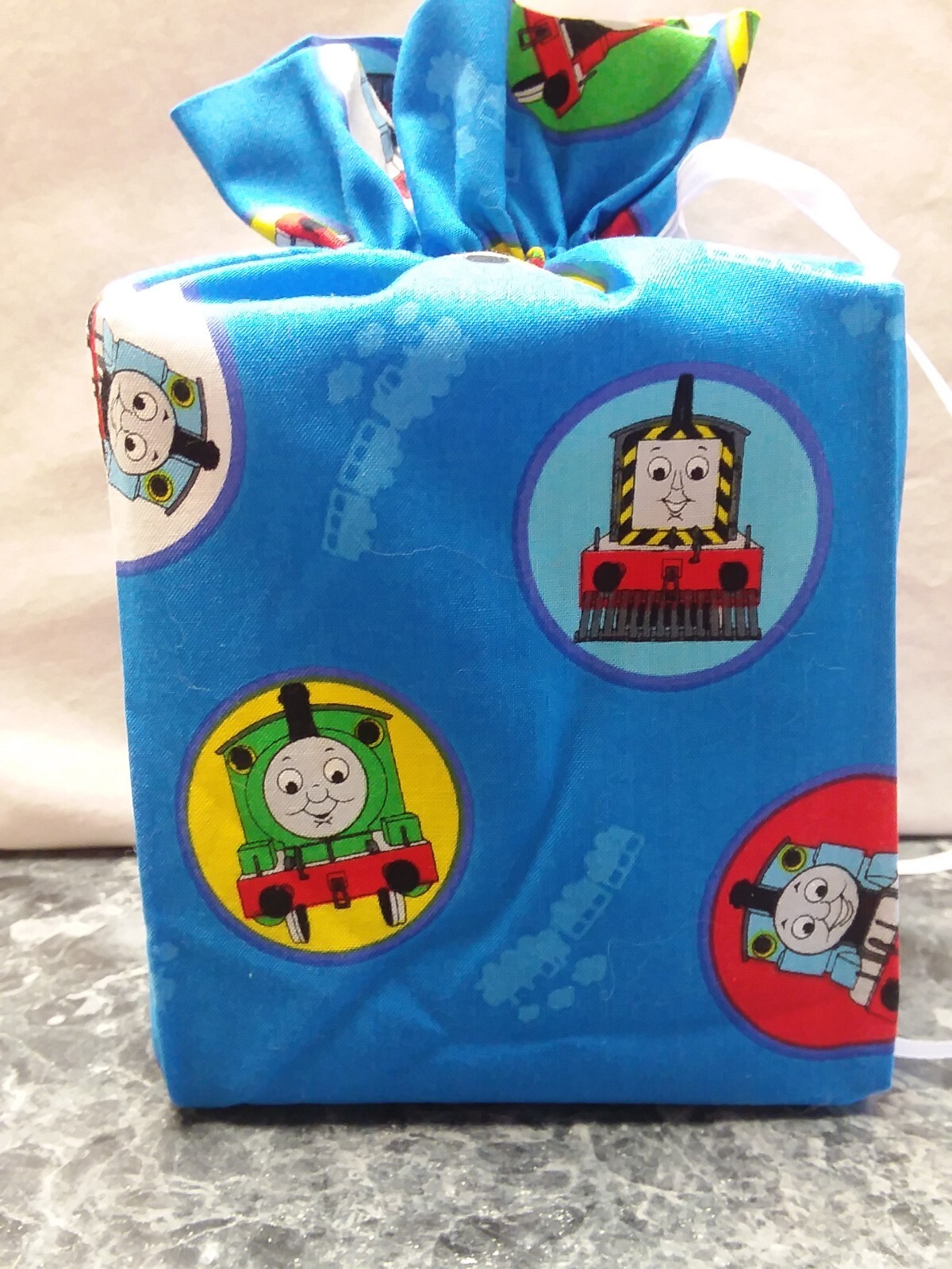 Thomas the Tank Train on blue cotton fabric, handmade, square tissue box cover