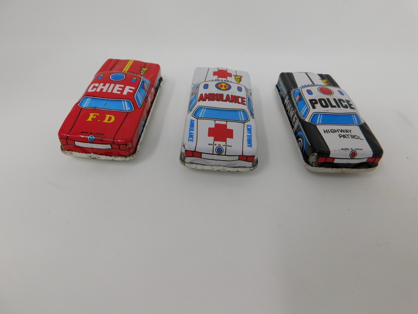 3 Vintage Tin Litho 3.25 Cars Ambulance, Police Fire Chief Made in Japan