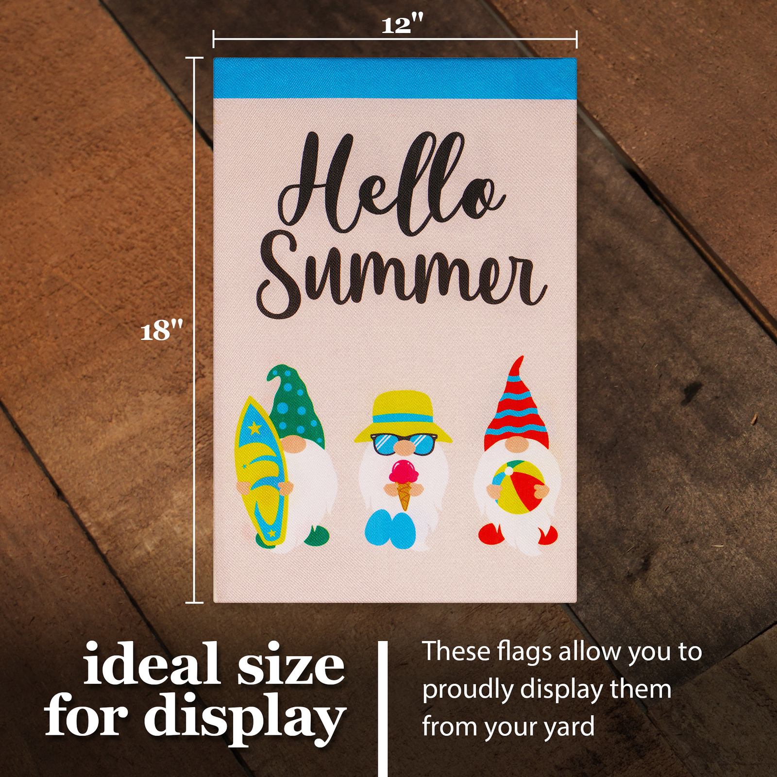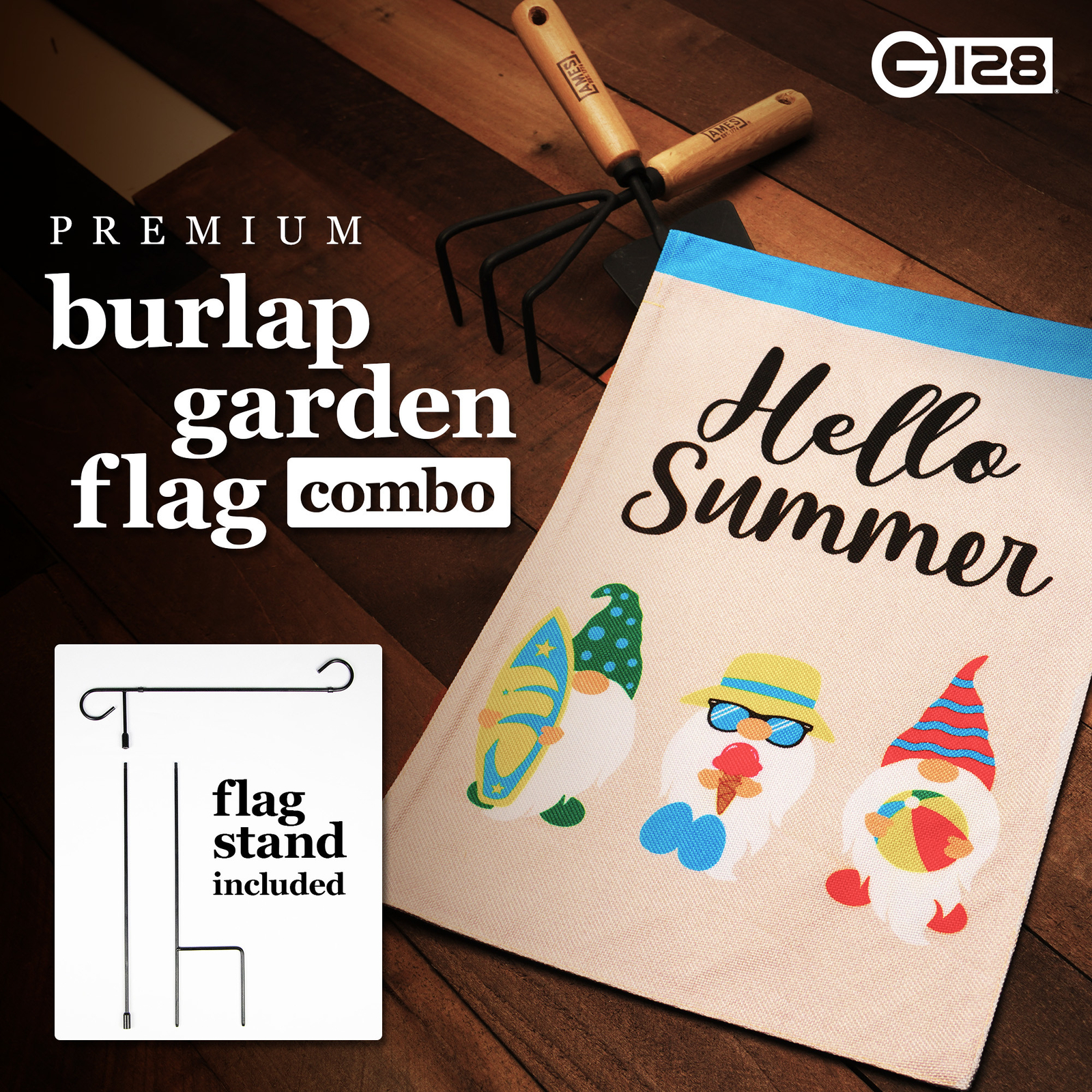 NEW G128 Garden Flag 3 Beach-Ready Gnomes 12x18IN Burlap Garden Flag Stand