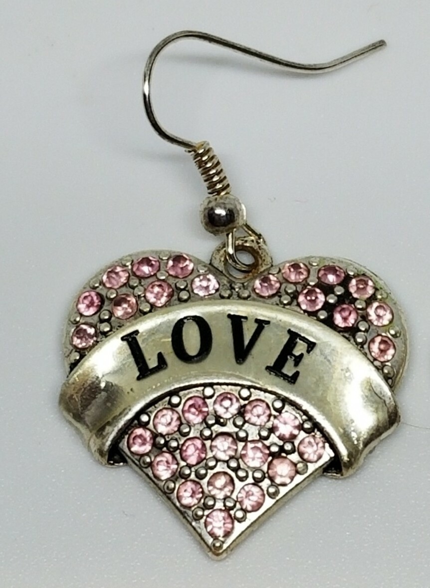 Pink Crystal Love Heart Silver Tone Dangle Earrings Valentine's Day