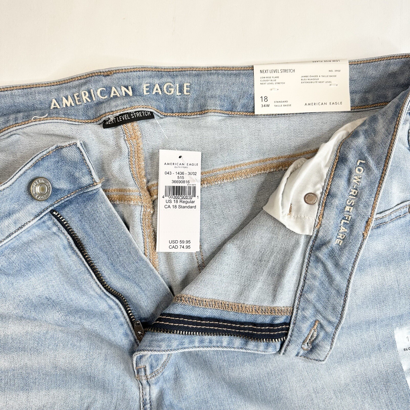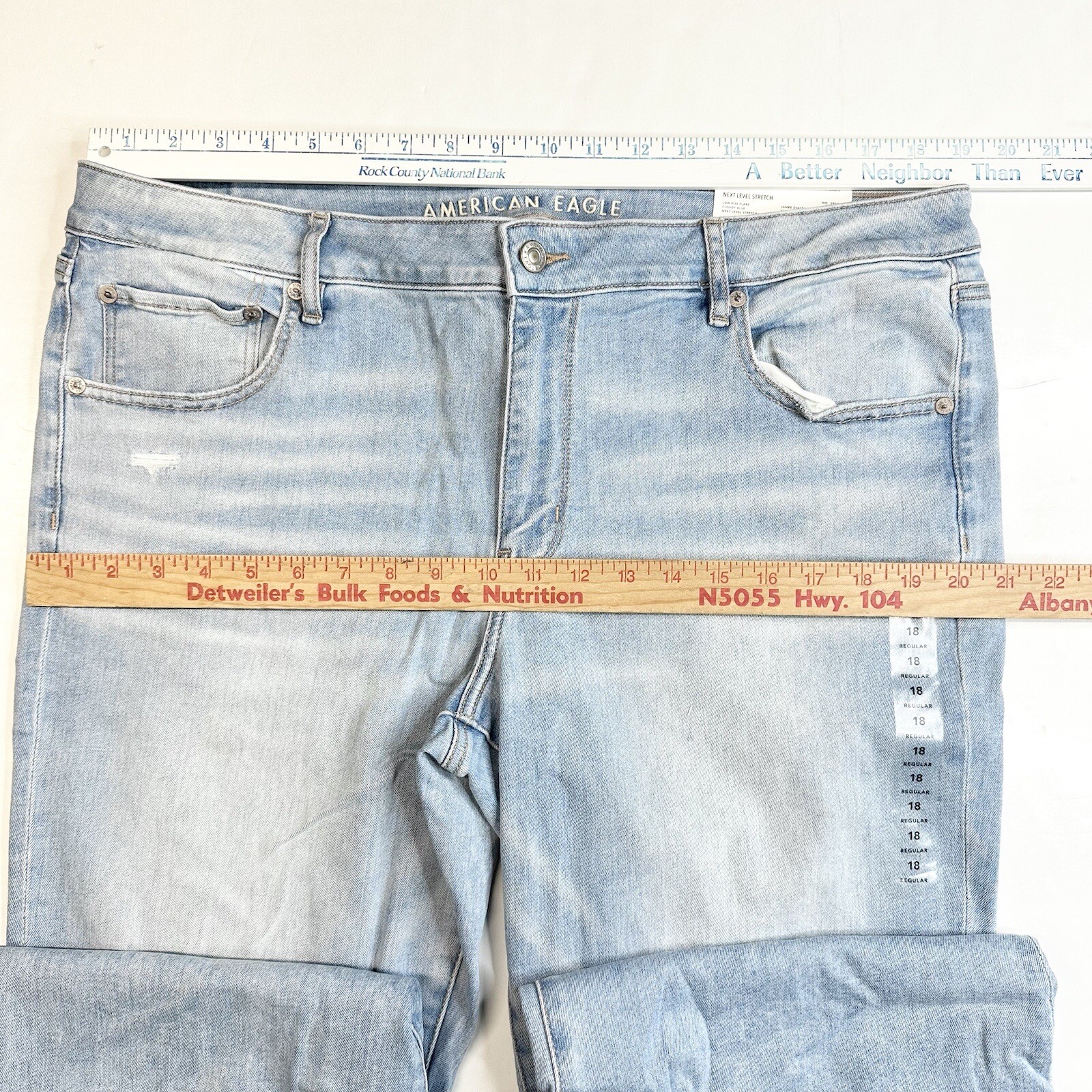 как выглядит American Eagle Jeans 18 Lowrise Flare Next Level Stretch Denim Distressed NEW фото
