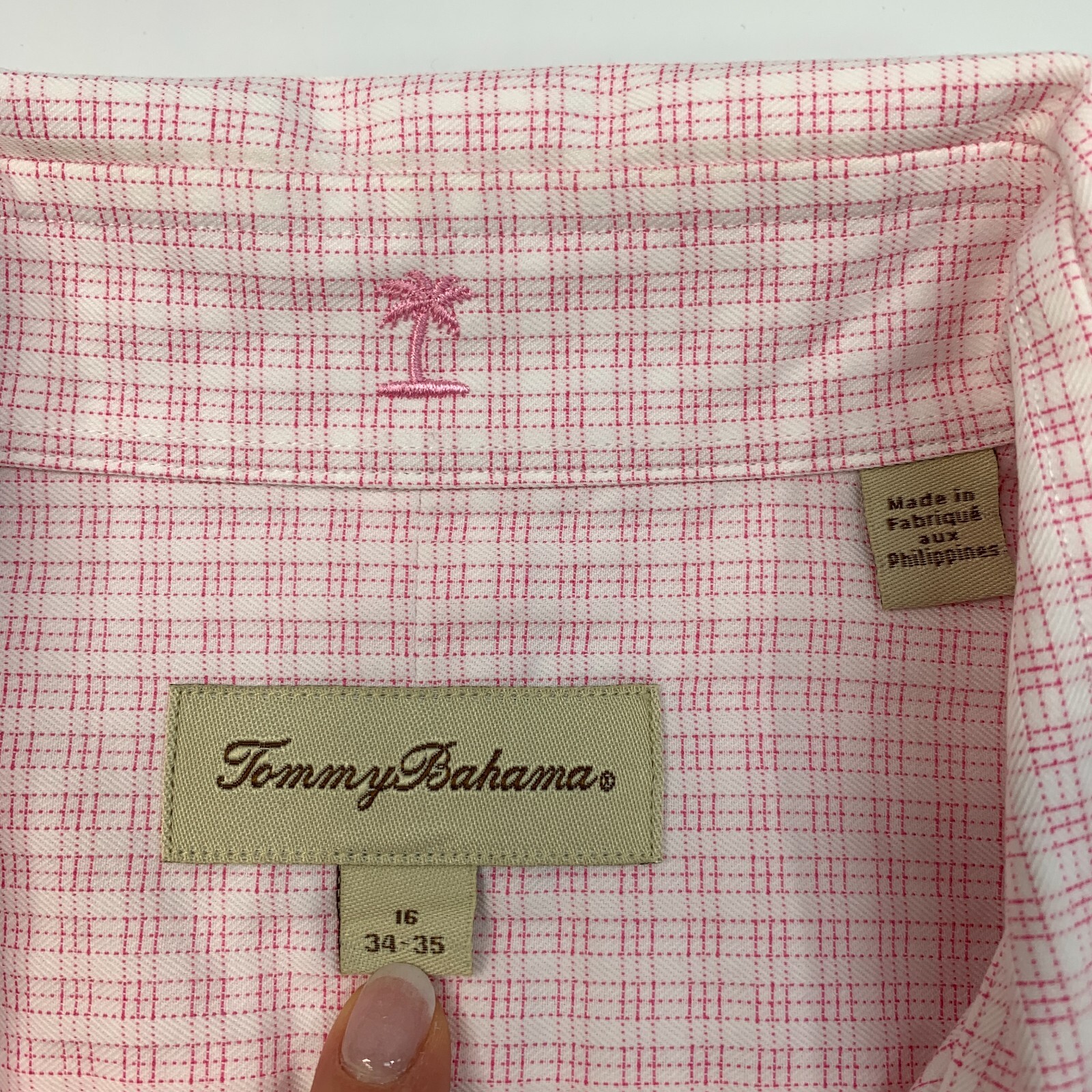Tommy Bahama Dress Shirt Mens 16 Pink White Plaid Long Sleeve Cotton Button Up
