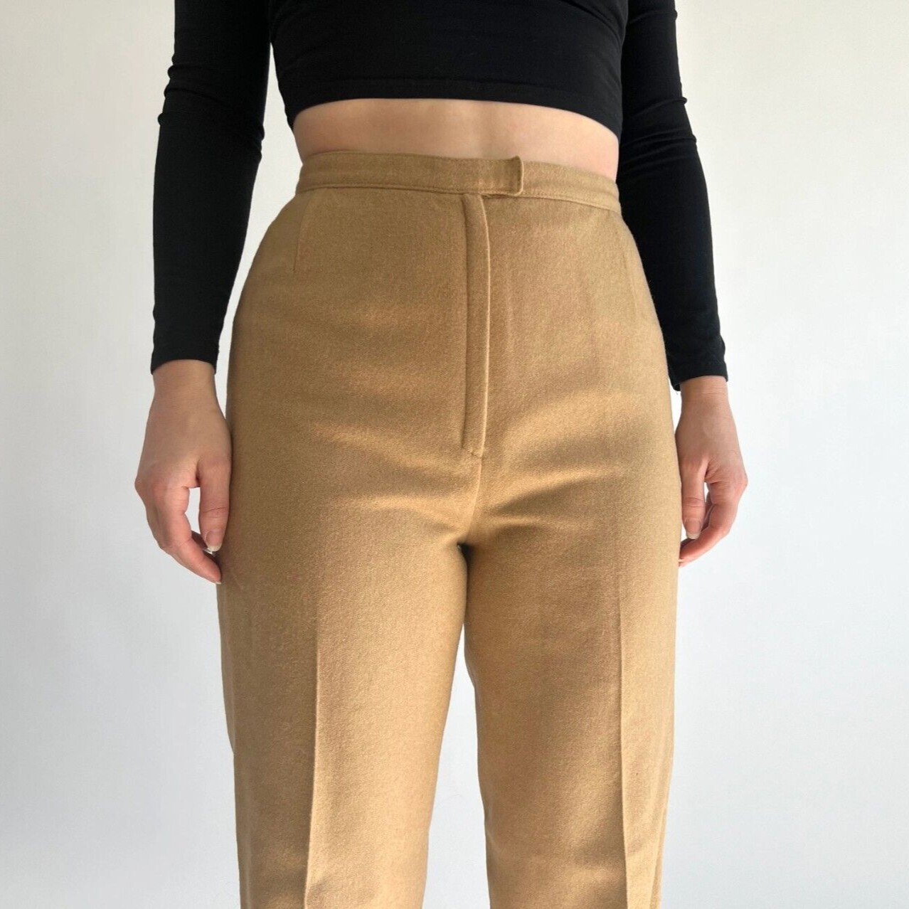 как выглядит 1960s high waist camel wool tapered trouser pants long inseam 26 w 32.5" in фото
