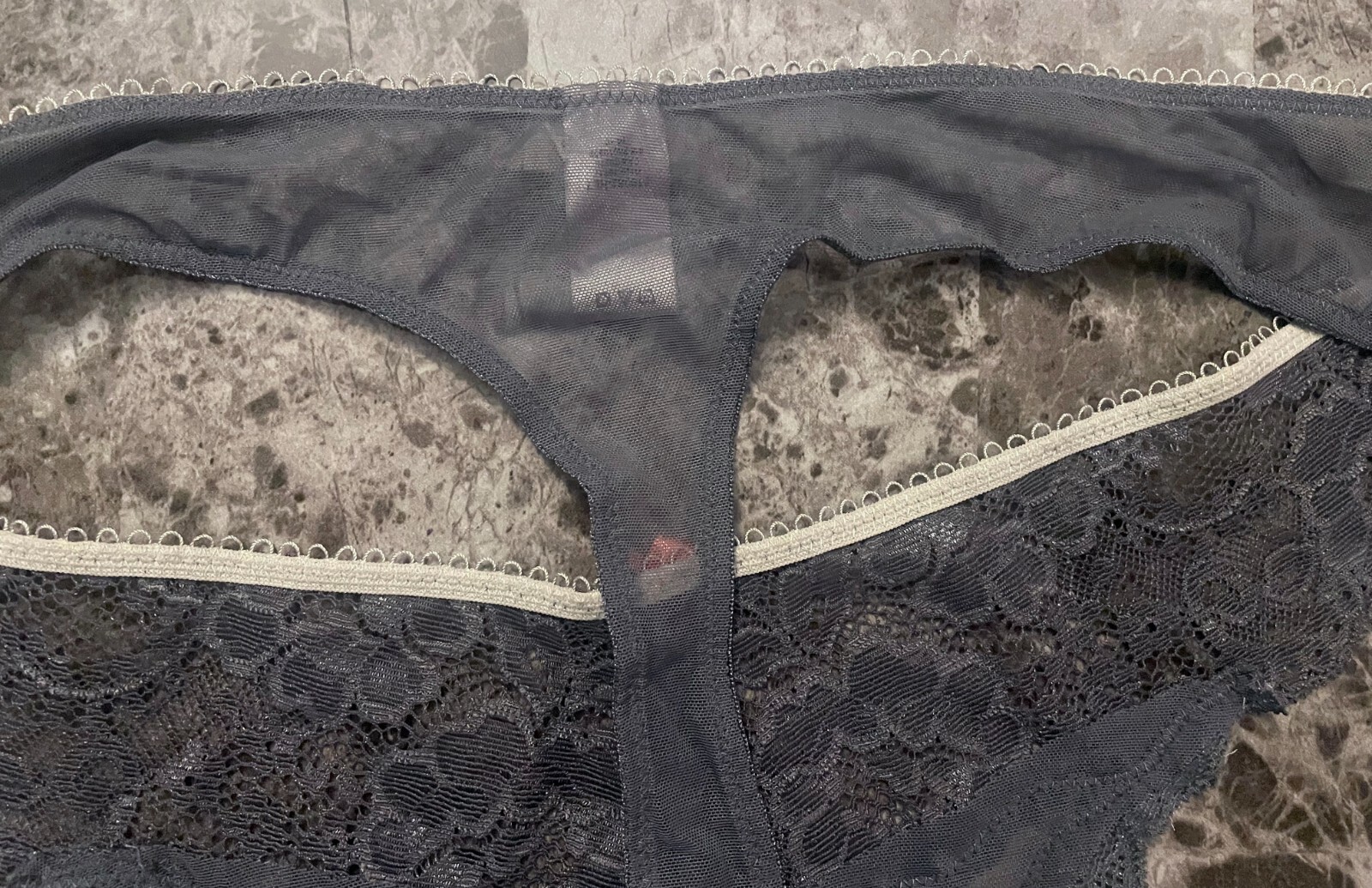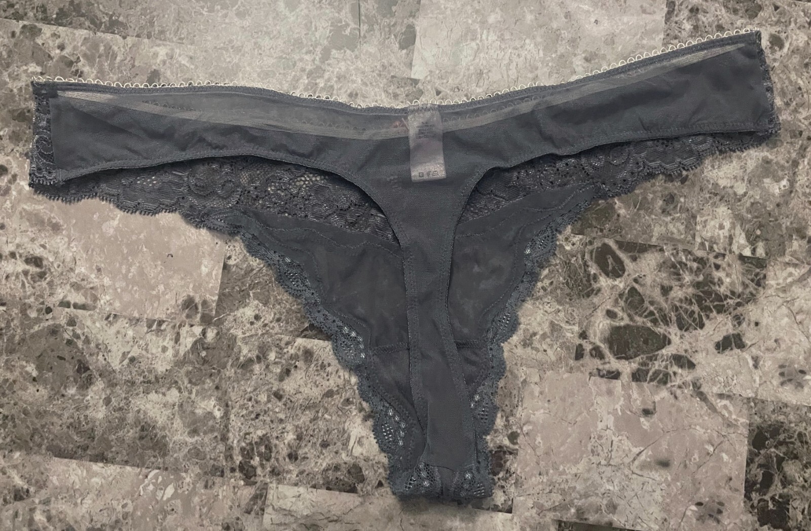 как выглядит VICTORIAS SECRET DREAM ANGELS L BLACK GRAY MESH LACE RARE THONG PANTIES READ фото