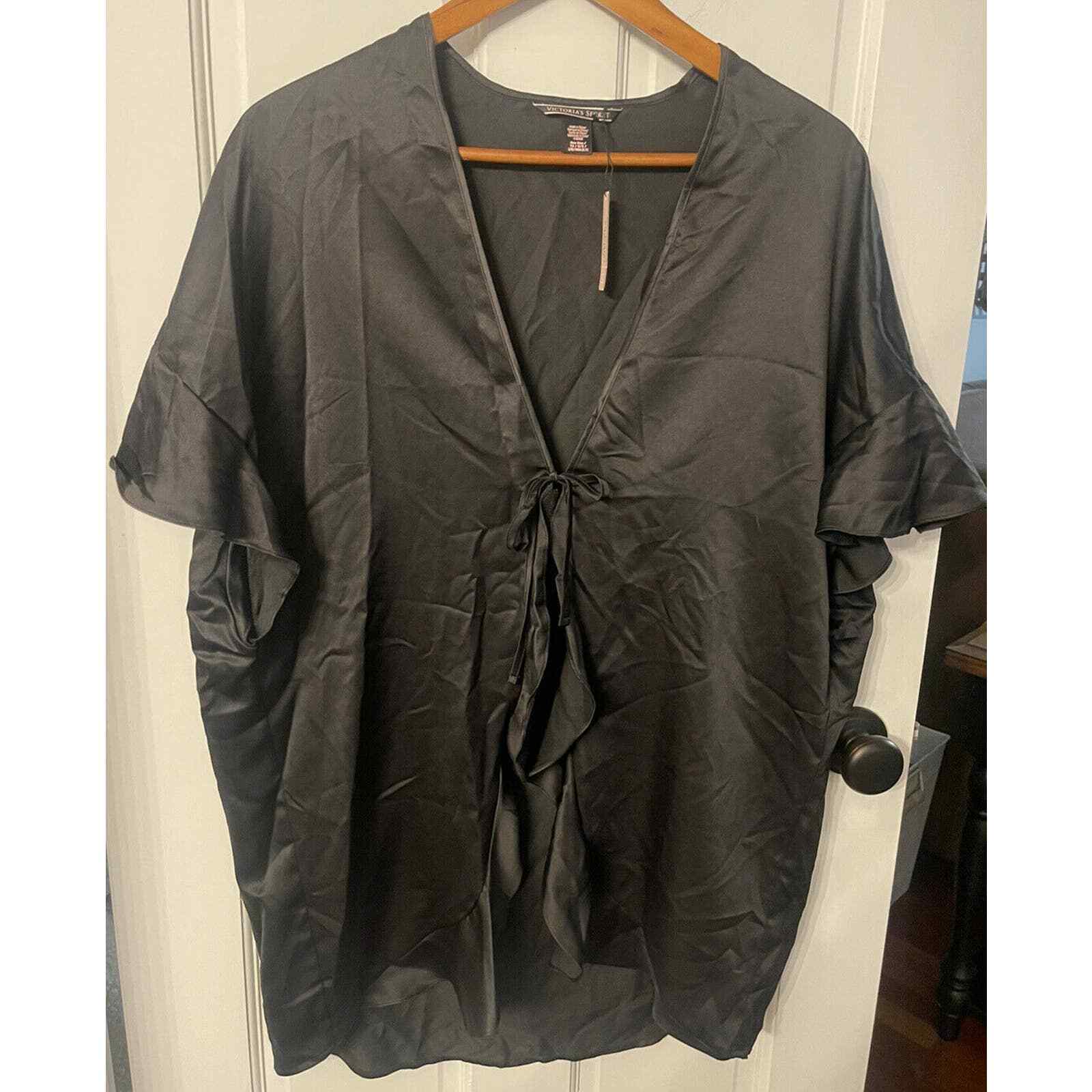 NEW Victoria s Secret Satin Ruffle Kimono robe Short sleeve Tie close O/S Black