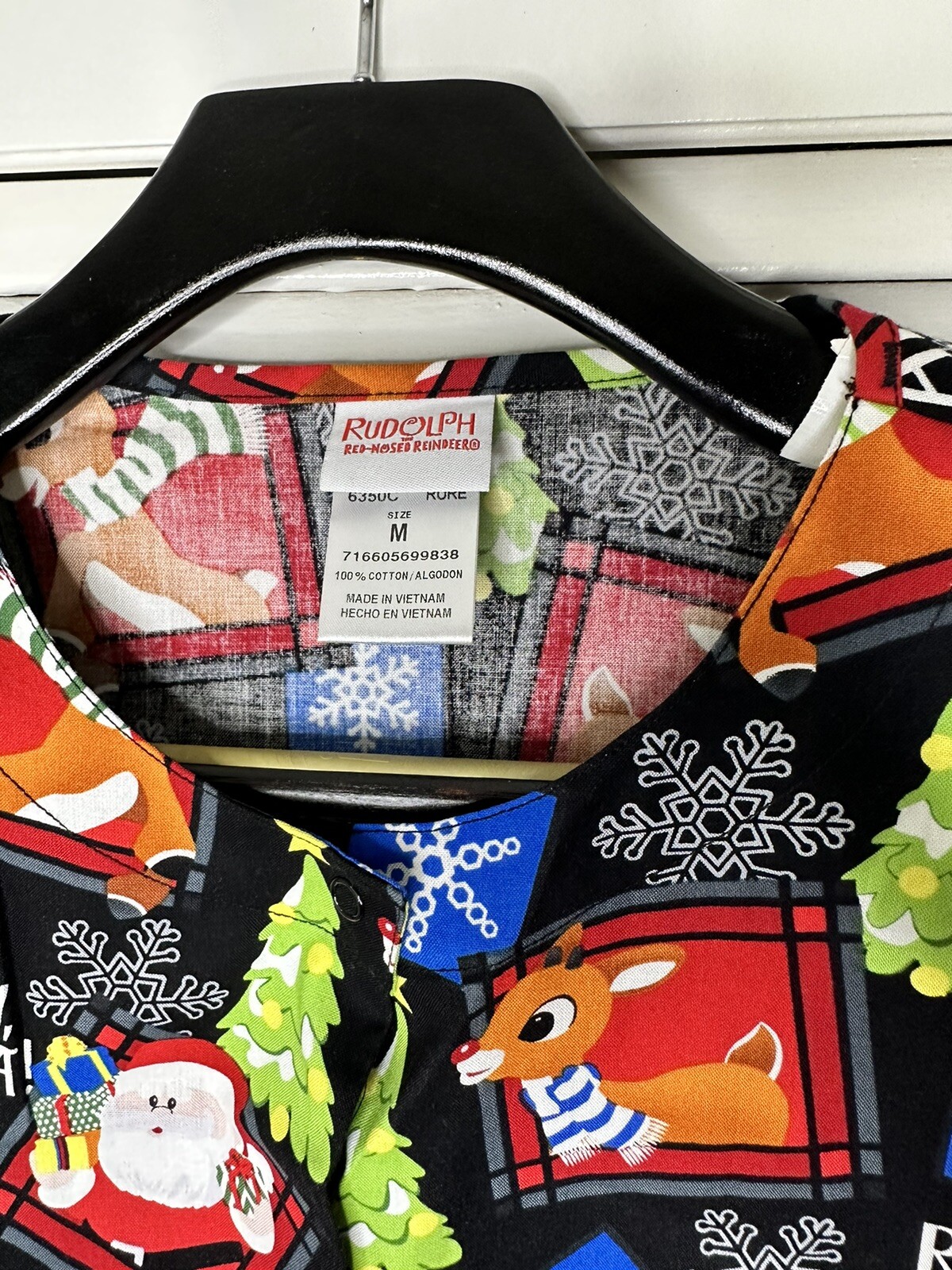 Womens Medical Nursing Scrub Medium Christmas Rudolph Santa Long Sleeve Black