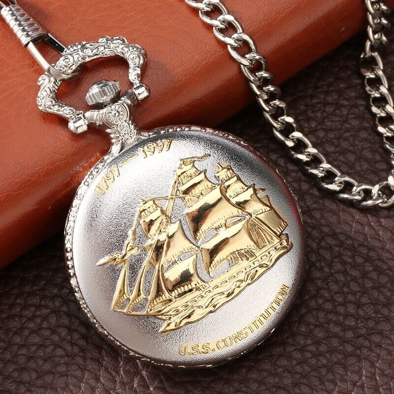 Silver Gold Sailboat Design Men Women Analog Quartz Pocket Watch Pendant Chain