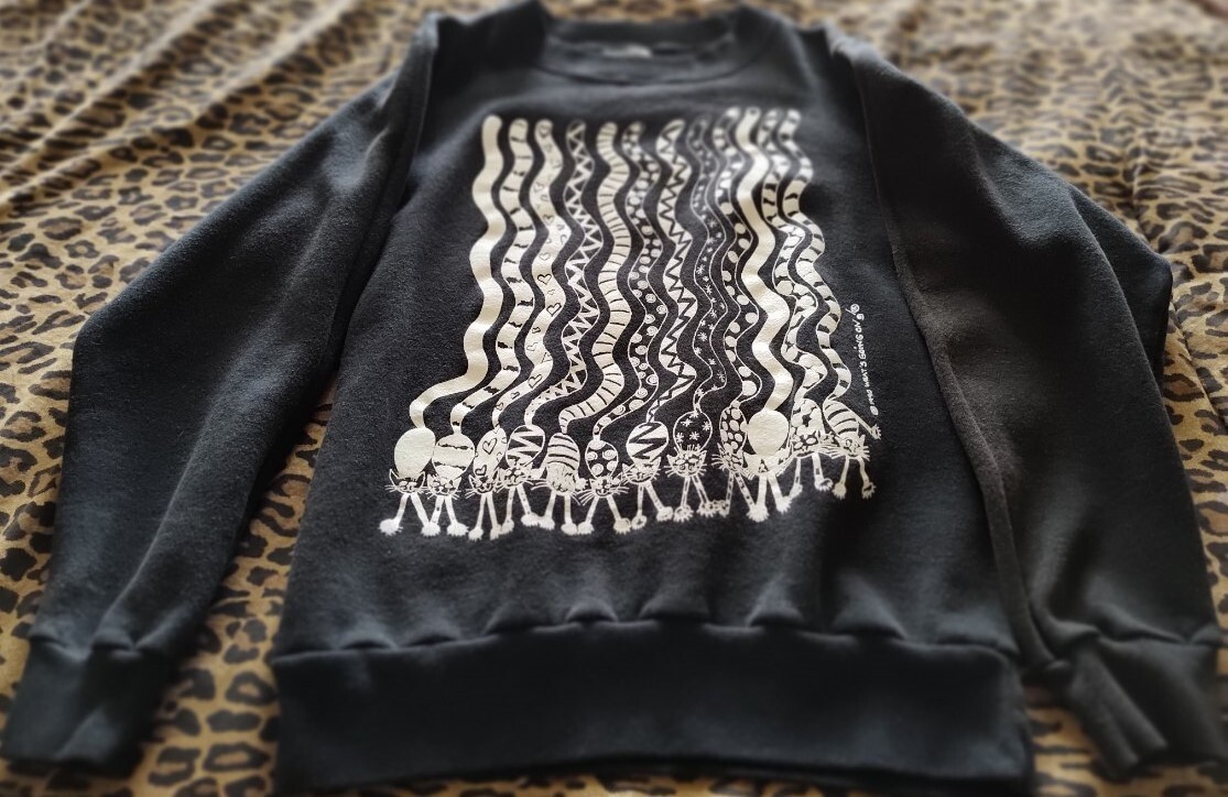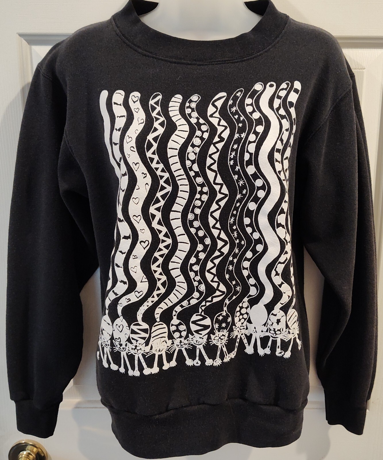 Vintage Black Crewneck Sweatshirt White Cats w/Tails 2 Sided SZ Small USA Funny
