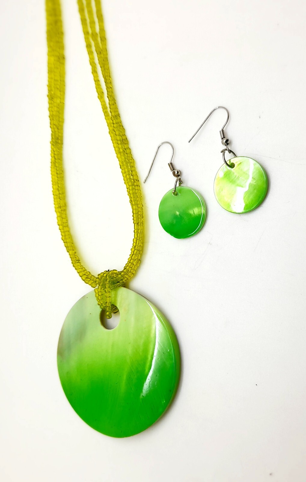 S001 Round shell Pendant green strand seed bead fashion necklace earrings set