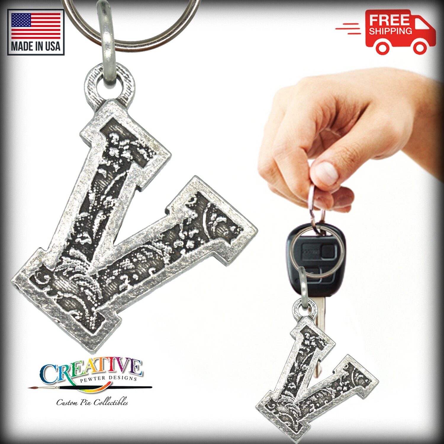 • Letter V Keychain, L022KC, 1 Inch, Alphabet, Initial, Personalized, Gift, Metal