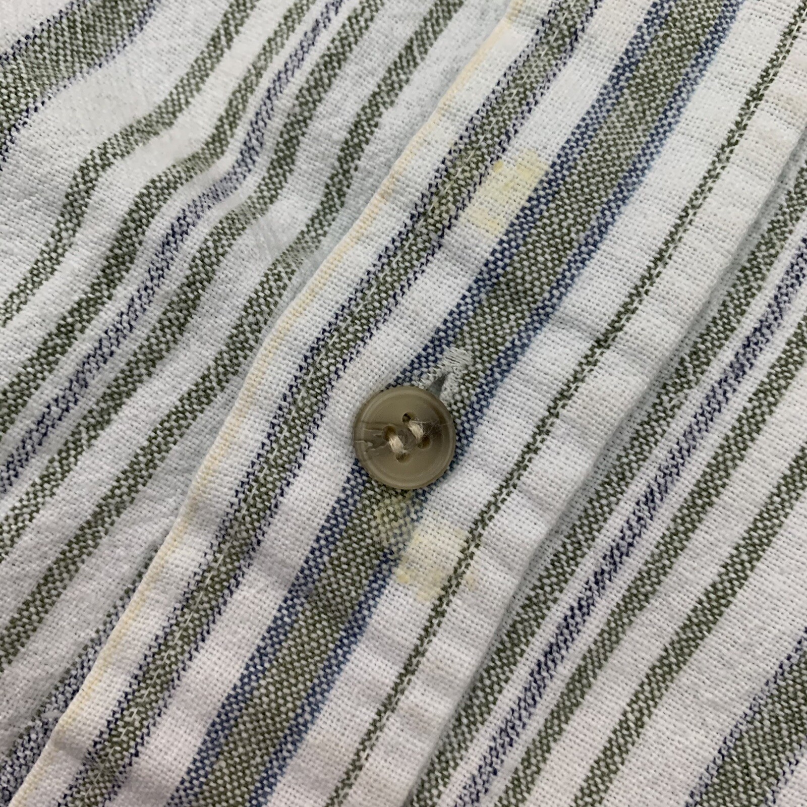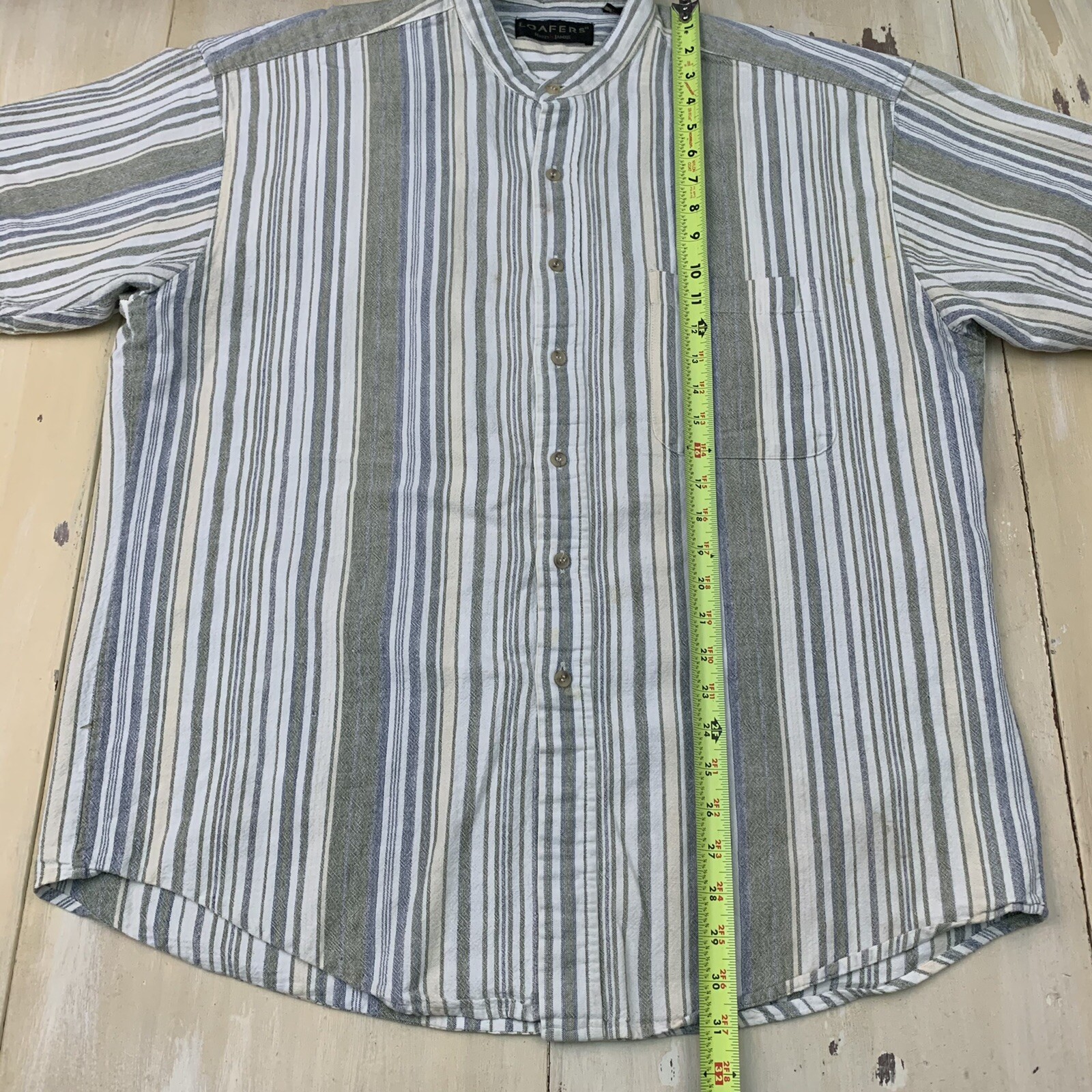 LOAFERS - Vtg 90s Striped Tan White Button-up Banded Collar Dad Shirt, Mens XL