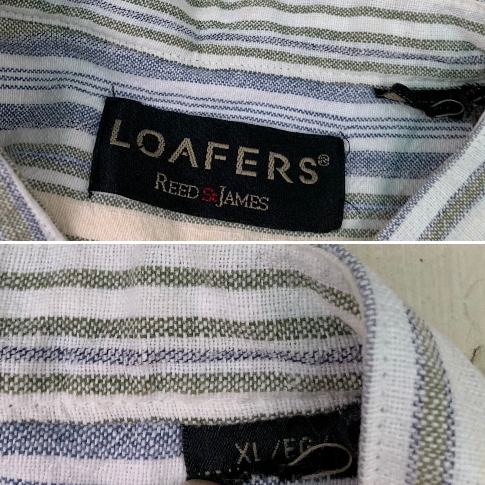 как выглядит LOAFERS - Vtg 90s Striped Tan White Button-up Banded Collar Dad Shirt, Mens XL фото