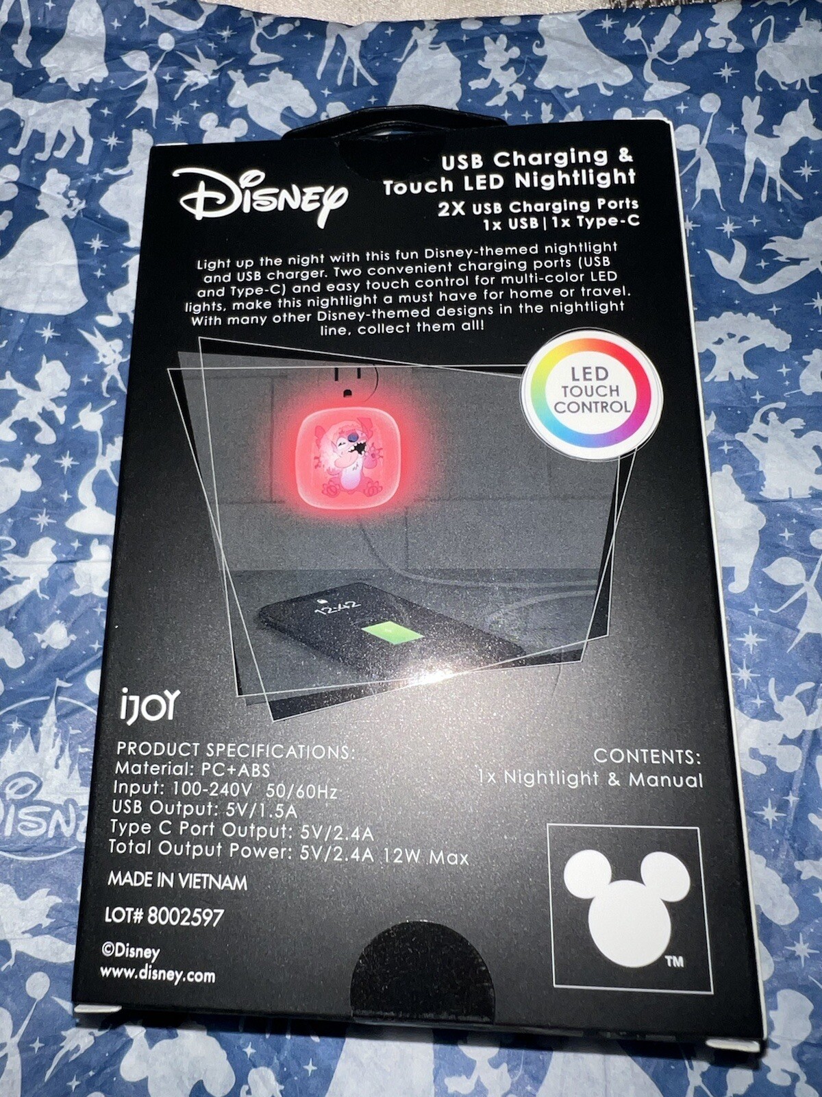 Disney Stitch USB Charging Touch LED Nightlight 2x USB Charging Ports 1 X USB