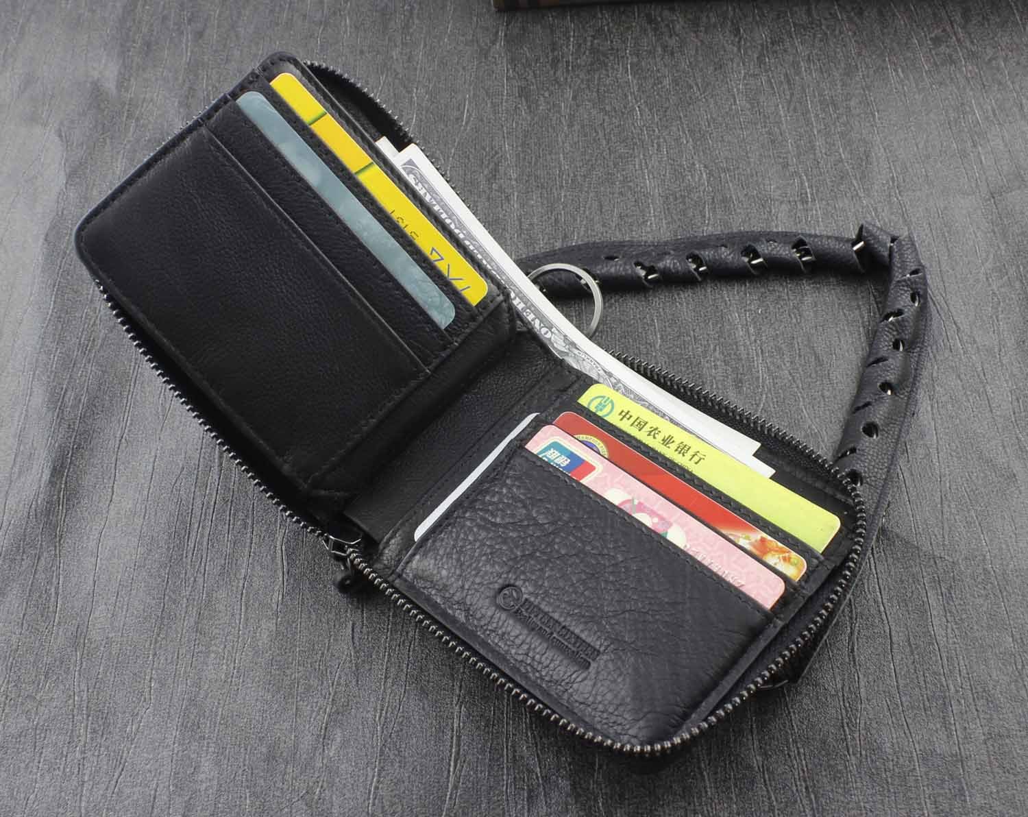 Wallet for Men Sheep Leather Zipper Card Biker Wallet With Safe Chain Black