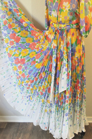 Vtg Elissa of California Two Piece Off Shoulder Blouse Accordion Skirt Flowers
