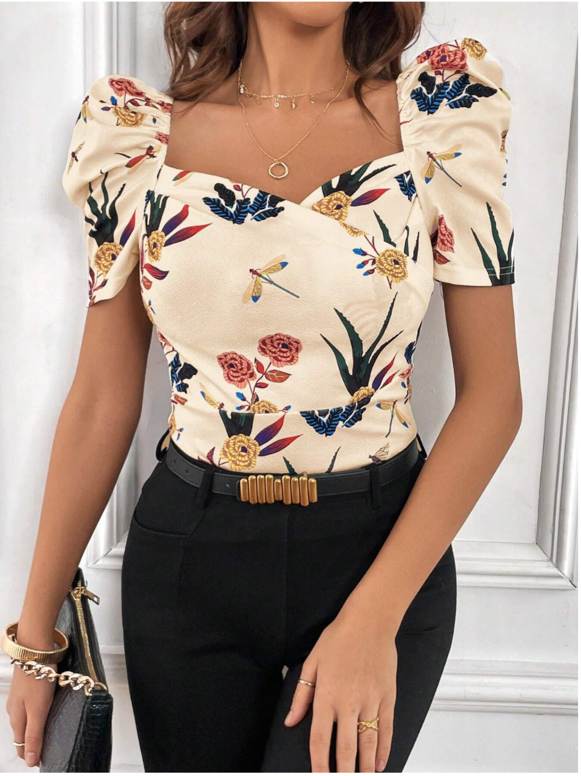 как выглядит Multicor Priv Floral Print Sweetheart Neck Puff Sleeve Summer Tee Sz XS S M LXL фото