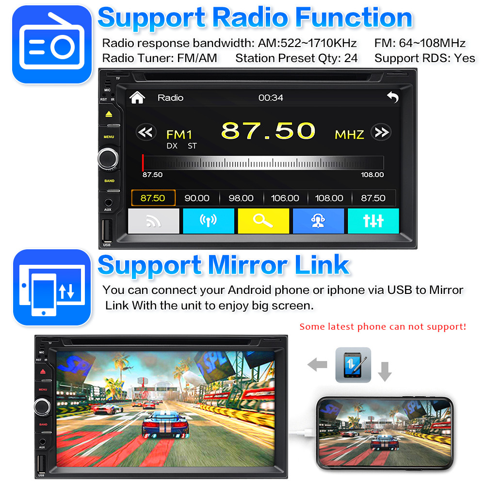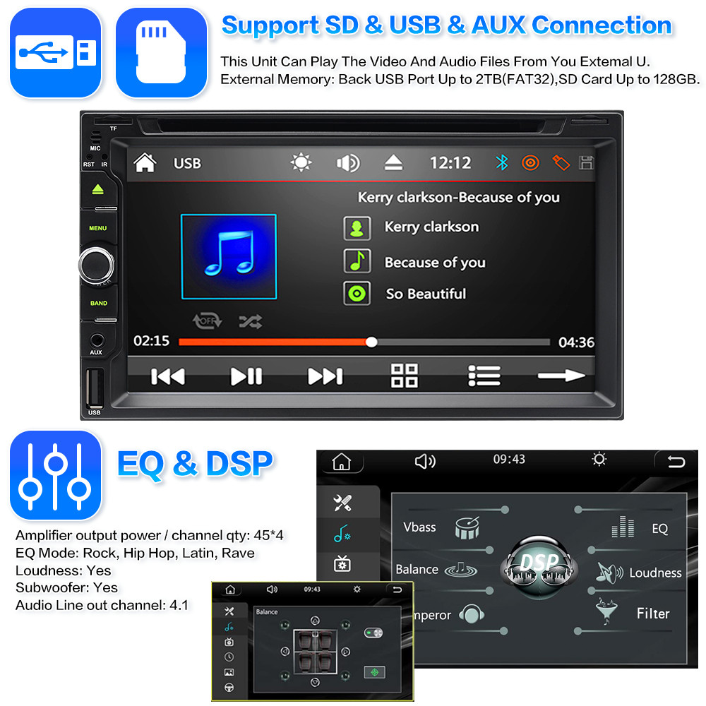 Apple CarPlay/Android Auto 7 Double 2DIN Car Stereo Radio DVD Player Bluetooth