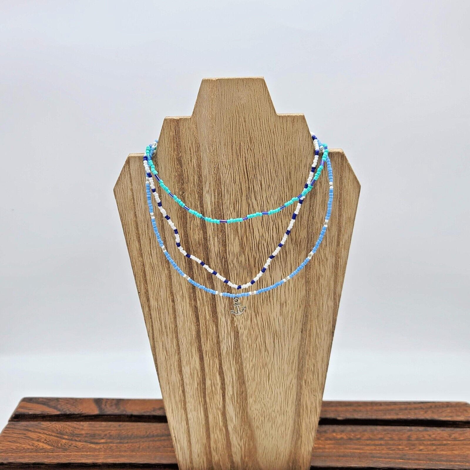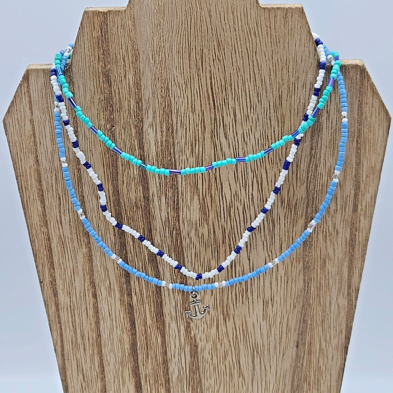 как выглядит 3 Pc Blue, Turquoise White Seed Bead Choker Necklace Set, 14" фото